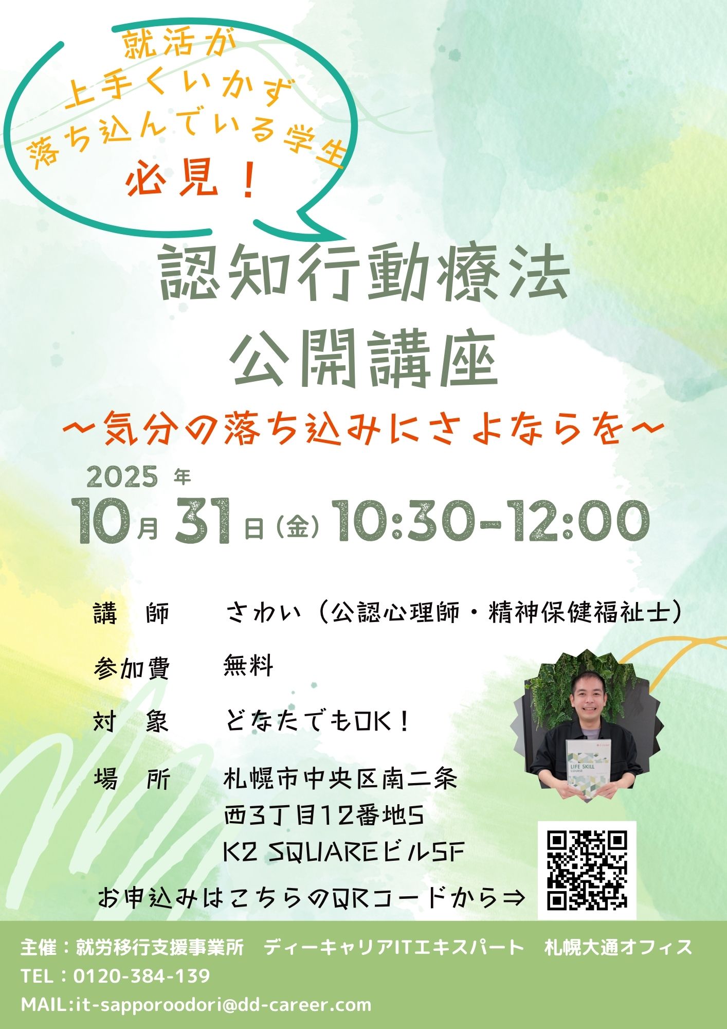 【ディーキャリアITエキスパート札幌大通オフィス 】10月31日(金)「就活で取り残されている感覚により落ち込んでいる学生必見!『認知行動療法公開講座!』」