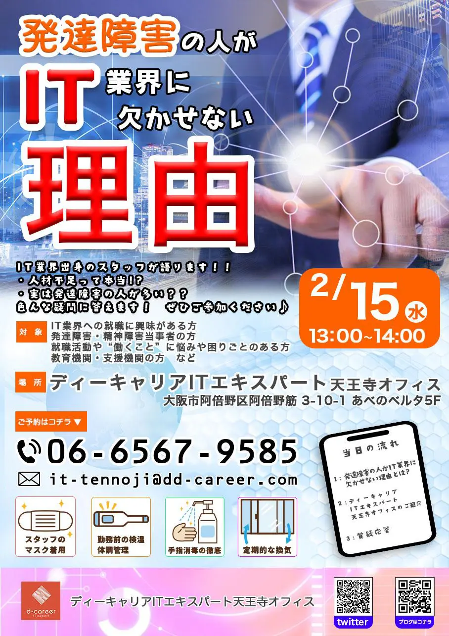 【ディーキャリアITエキスパート天王寺オフィス】2月15日(水)「発達障害の人がIT業界に欠かせない理由」