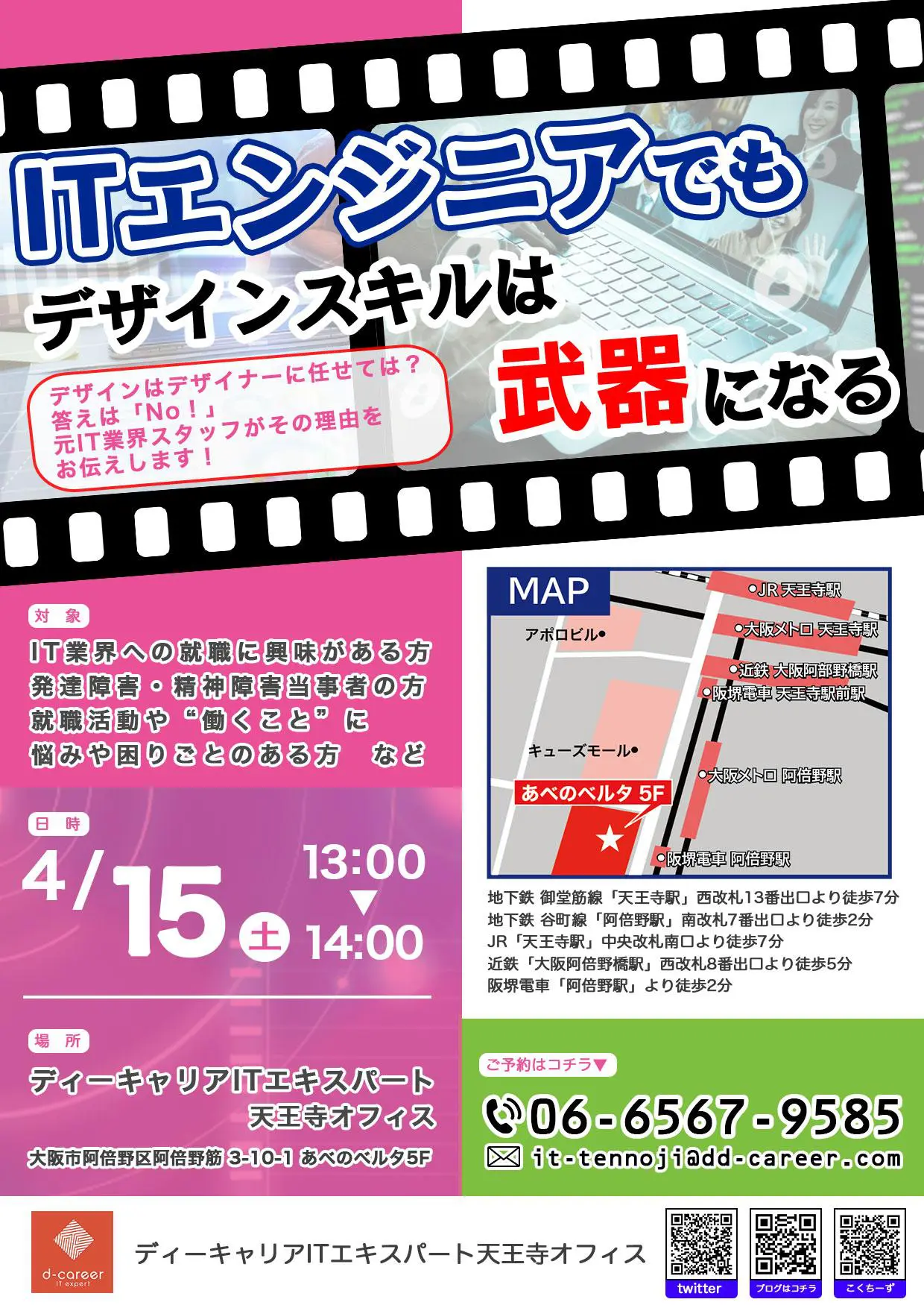 【ディーキャリアITエキスパート天王寺オフィス】4月15日(土)「ITエンジニアでもデザインスキルは武器になる」
