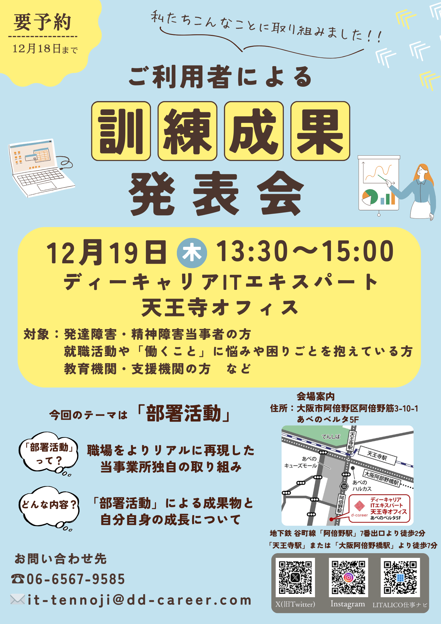 【ディーキャリアITエキスパート天王寺オフィス】12月19日(木)「私たちこんなことに取り組みました!!ご利用者による訓練成果発表会」