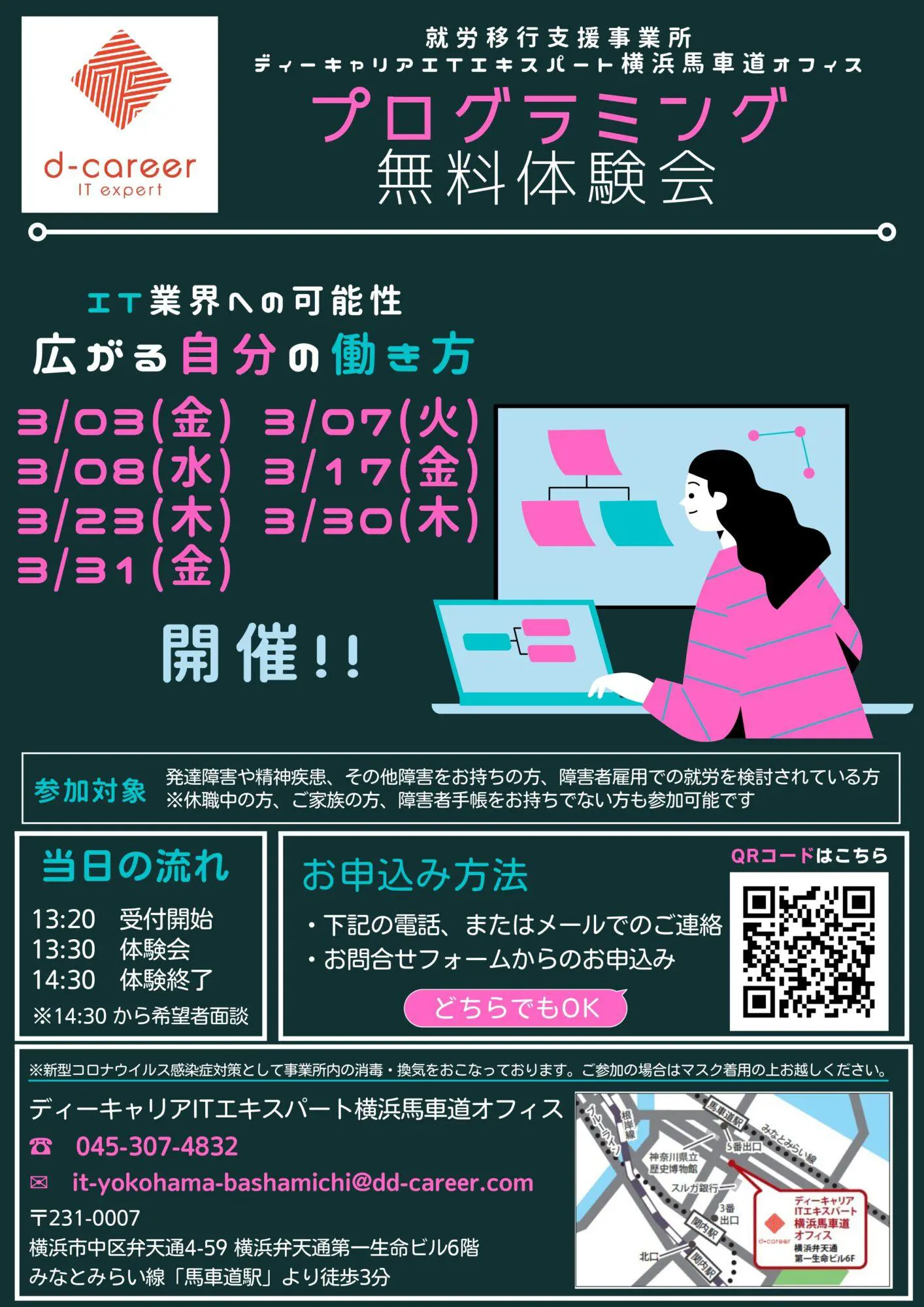 【ディーキャリアITエキスパート横浜馬車道オフィス】3月3日(金)「大人の発達障害の特性による困りごとがある方へ! IT業界・パソコン業界への就職のための無料プログラミング体験会&無料相談会」