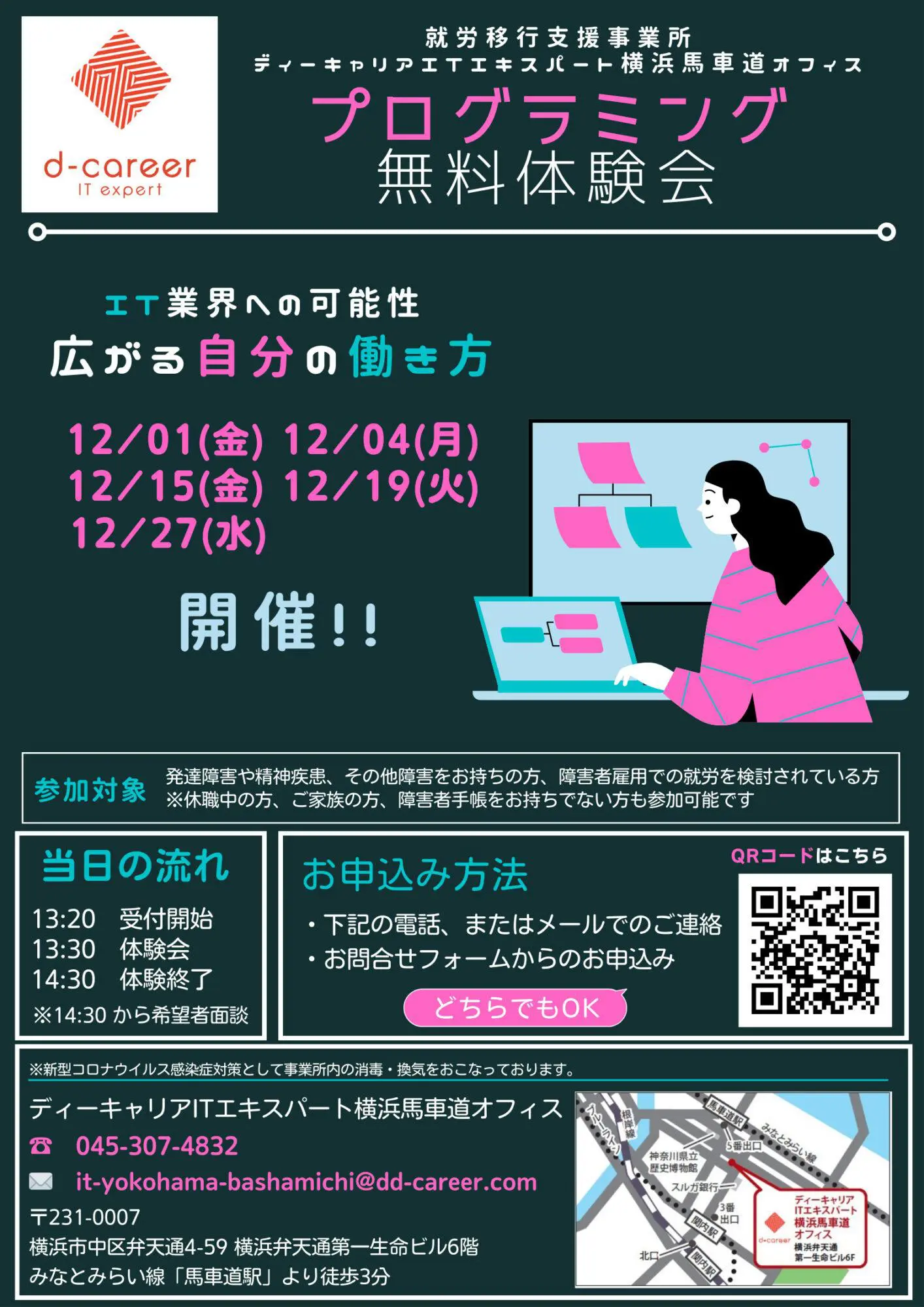 【ディーキャリアITエキスパート横浜馬車道オフィス】12月01日(金)・04日(月)・15日(金)・19日(火)・27日(水)「大人の発達障害の特性による困りごとがある方へ! IT業界・パソコン業界への就職のための無料プログラミング体験会&無料相談会」