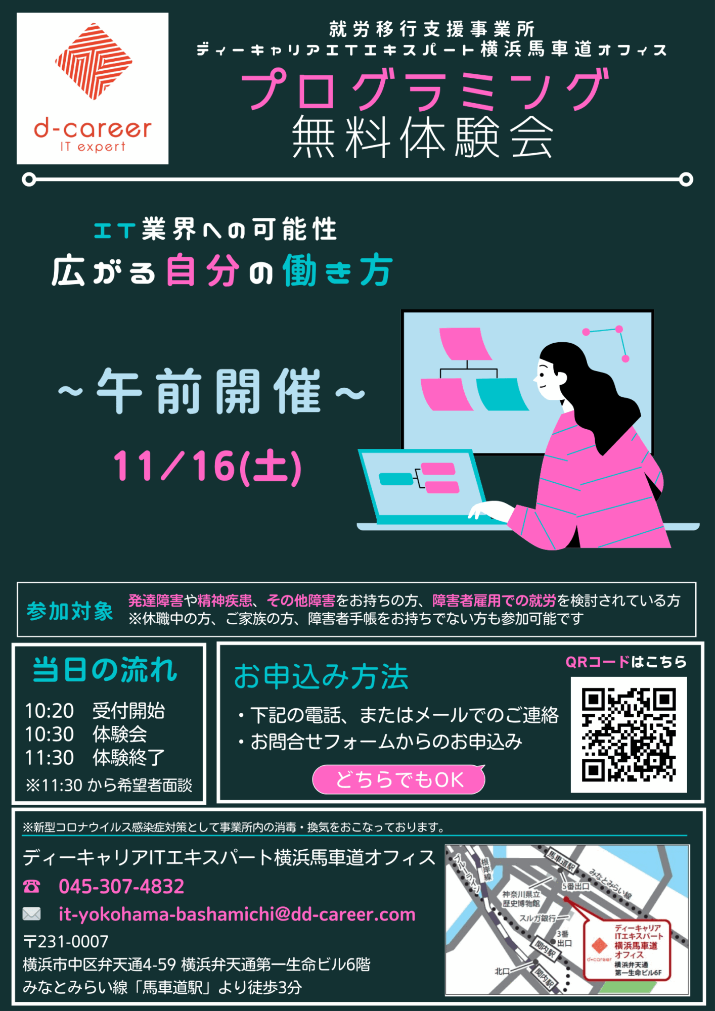 【ディーキャリアITエキスパート横浜馬車道オフィス】11月16日(土)「大人の発達障害の特性による困りごとがある方へ! IT業界・パソコン業界への就職のための無料プログラミング体験会&無料相談会」