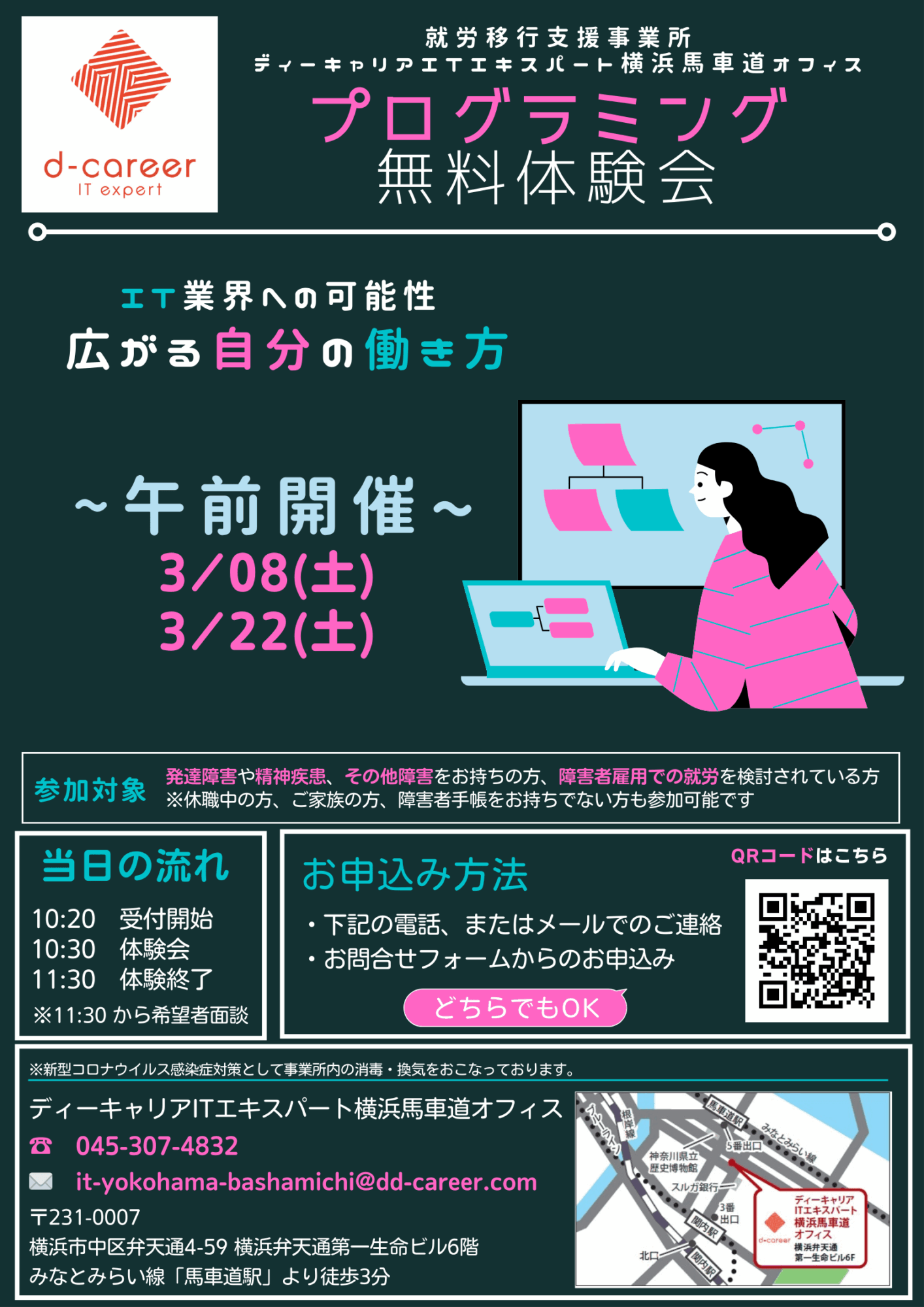 【ディーキャリアITエキスパート横浜馬車道オフィス】03月08日(土)・22日(土)「大人の発達障害の特性による困りごとがある方へ! IT業界・パソコン業界への就職のための無料プログラミング体験会&無料相談会」