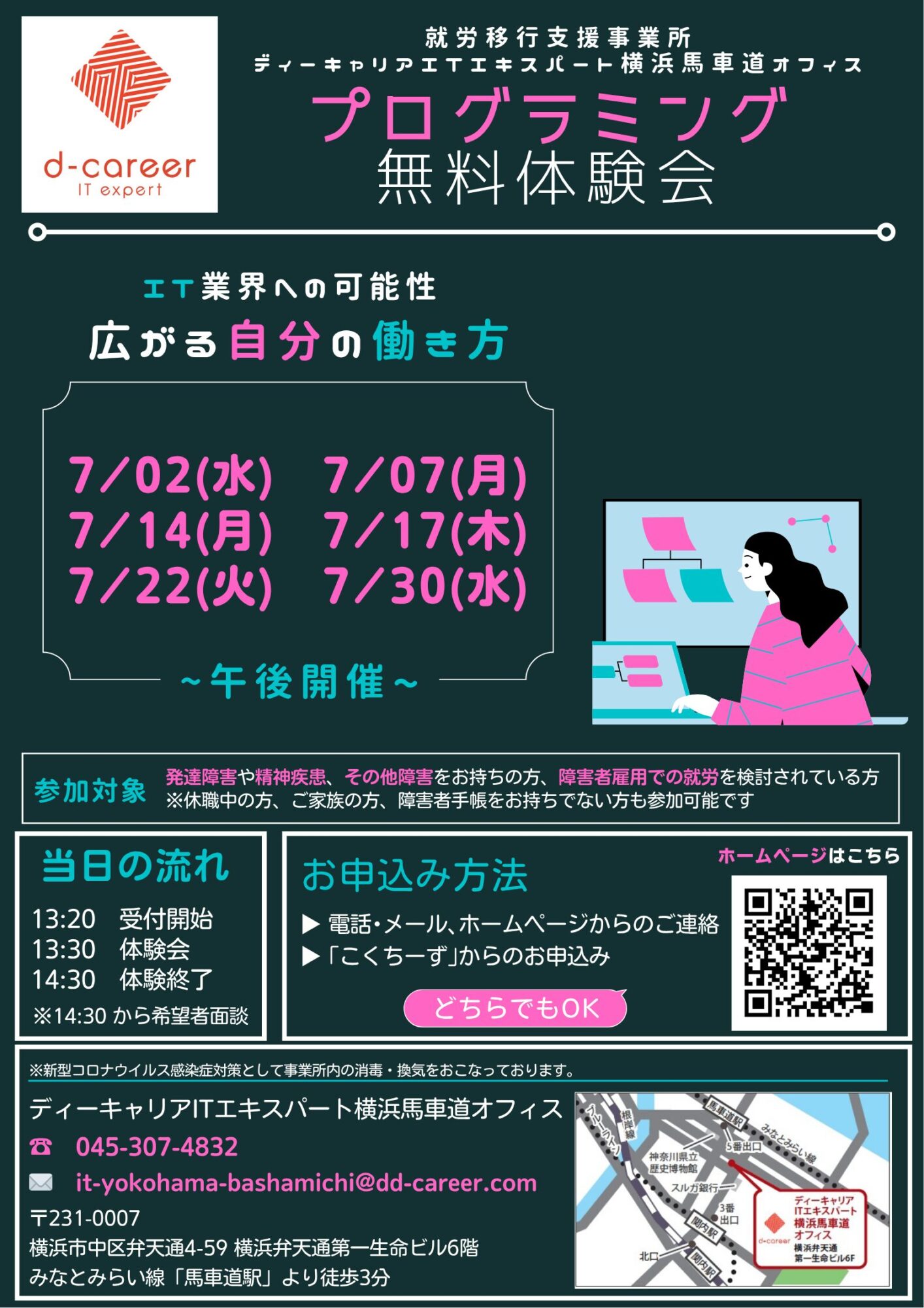 【ディーキャリアITエキスパート横浜馬車道オフィス】07月02日(水)・07日(月)・14日(月)・17日(木)・22日(火)・30日(水)「大人の発達障害の特性による困りごとがある方へ! IT業界・パソコン業界への就職のための無料プログラミング体験会&無料相談会」