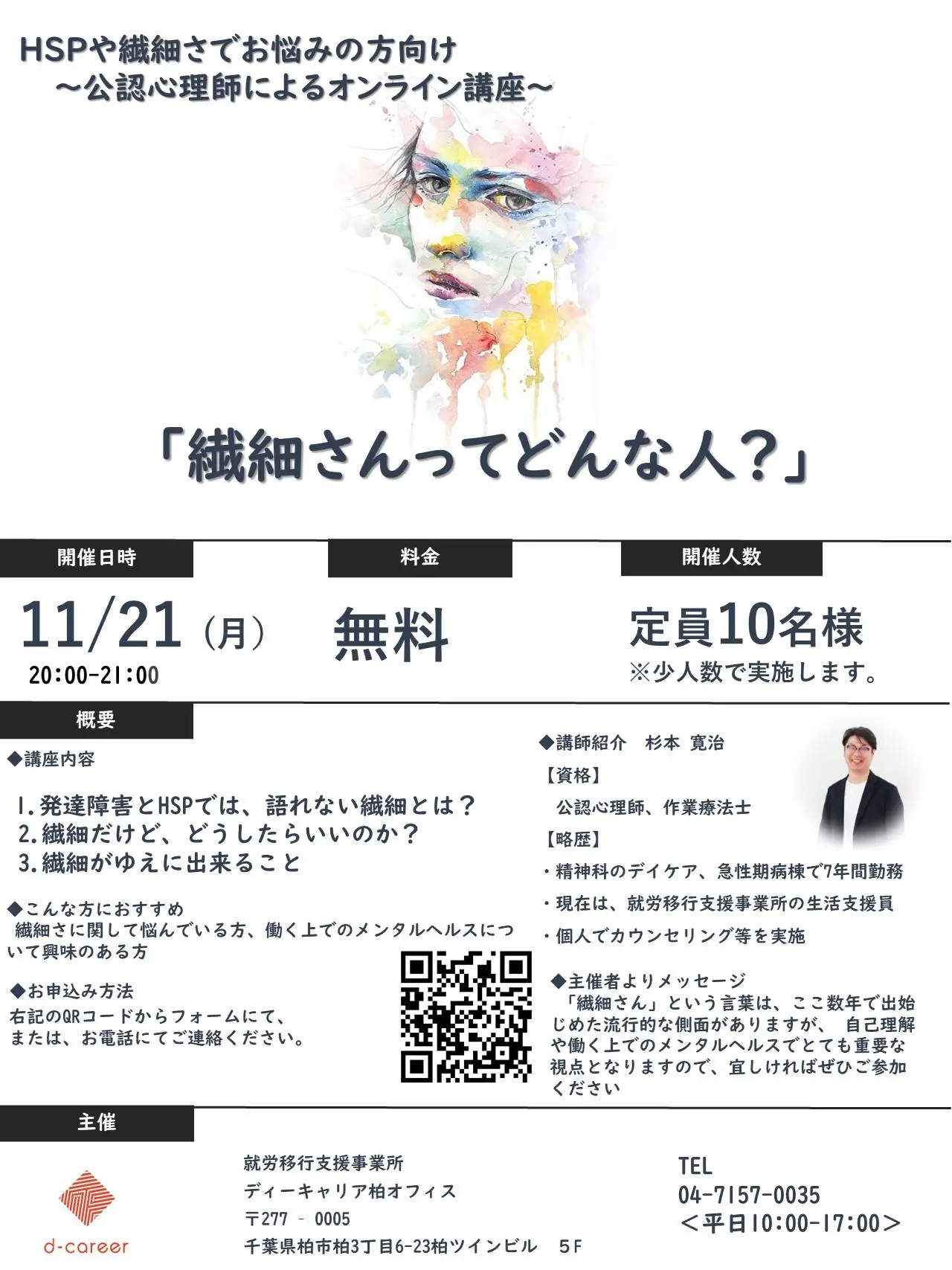 【ディーキャリア柏オフィス】11月21日(月)「繊細さんってどんな人? ~公認心理師によるオンライン講座~」