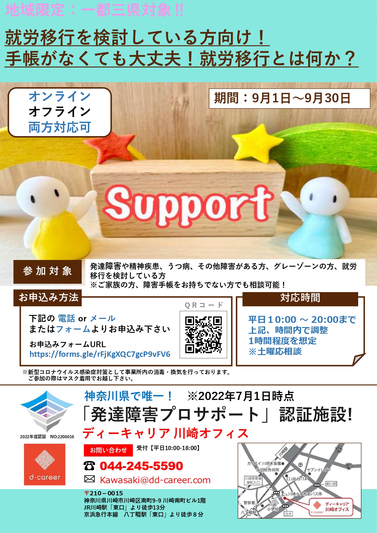 【ディーキャリア川崎オフィス】9月1日(水)~9月30日(木)「発達障害の特性による困りごとのある方向け「精神保健福祉士による無料相談」」