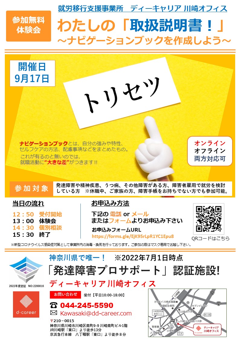 【ディーキャリア川崎オフィス】9月17日(土)「わたしの「取扱説明書!」 ~ナビゲーションブックを作成しよう~ 」