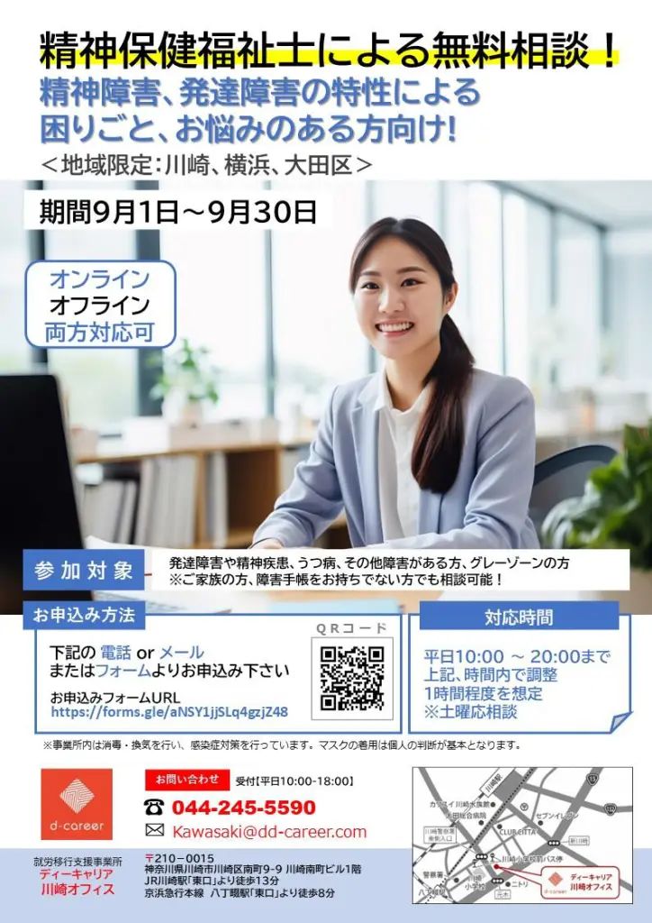 【ディーキャリア川崎オフィス】9月平日毎日開催「<地域限定:川崎、横浜、大田区にお住いの方> 【精神保健福祉士】による【無料相談】 精神障害、発達障害の特性による 困りごと、お悩みのある方向け!」