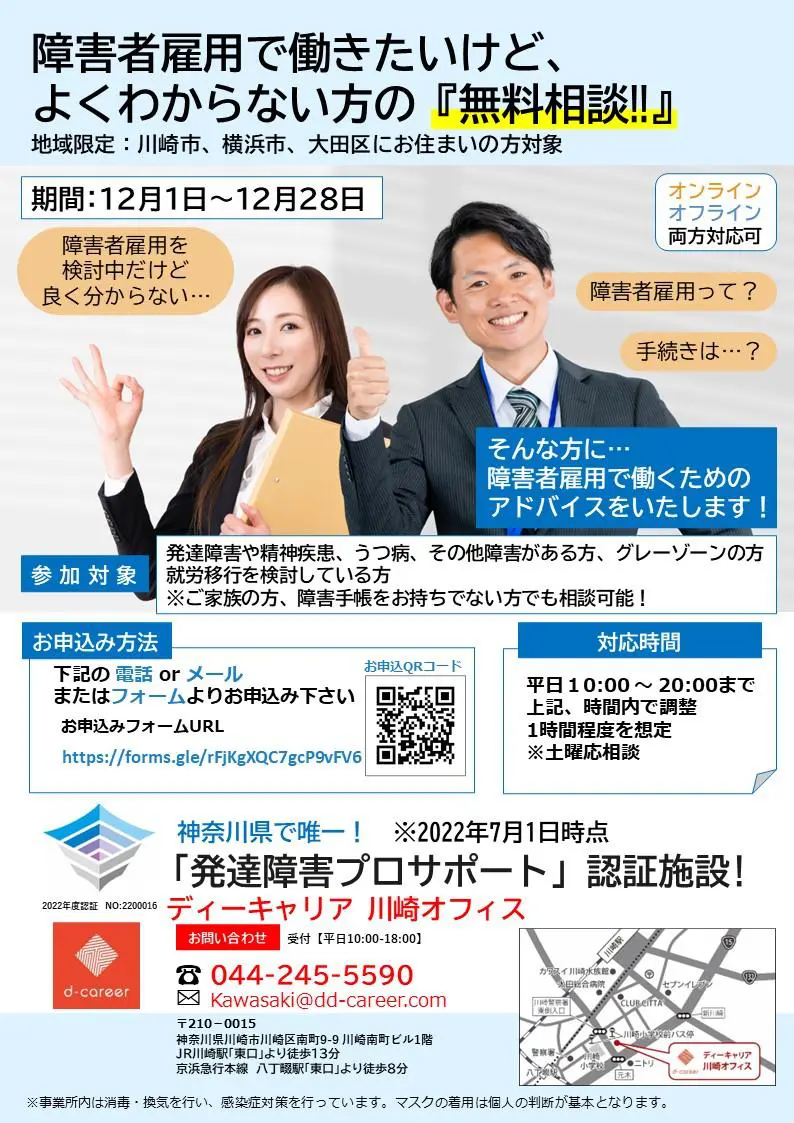 【ディーキャリア川崎オフィス】12月平日開催「<地域限定:川崎市、横浜市、大田区にお住まいの方対象> 障害者雇用で働きたいけど良くわからない方の『無料相談‼』」