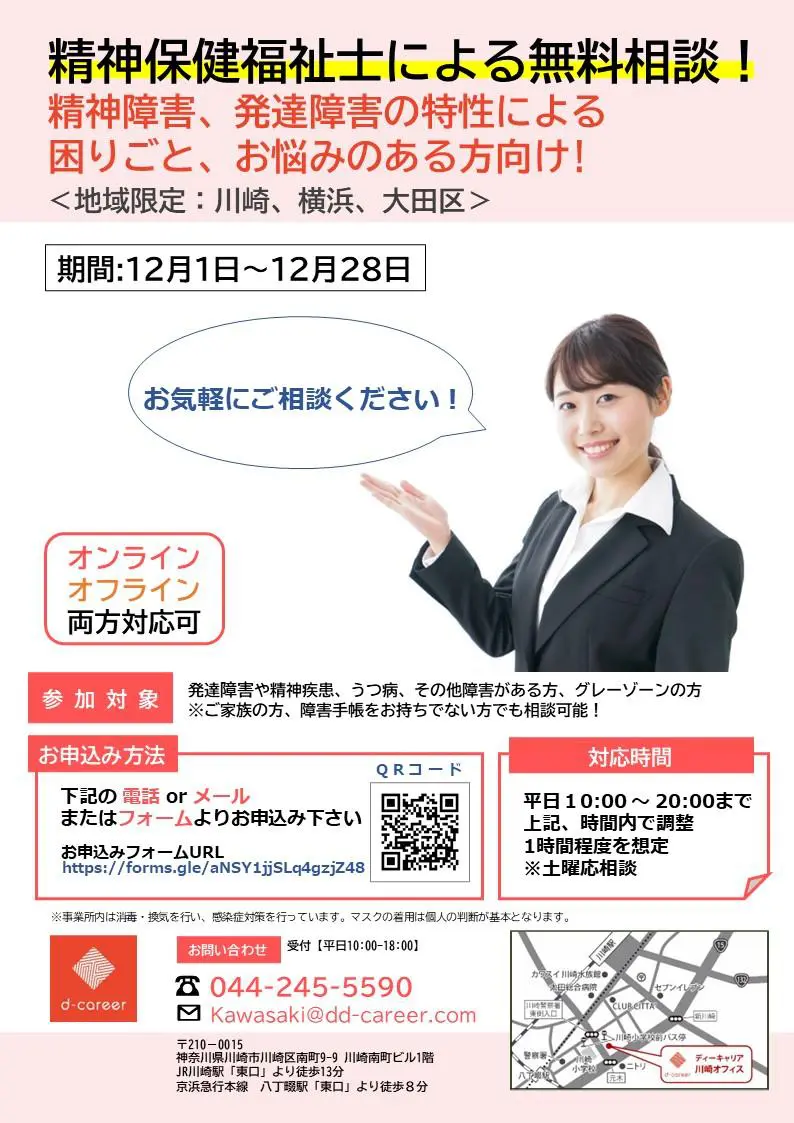 【ディーキャリア川崎オフィス】12月平日開催「<地域限定:川崎、横浜、大田区にお住いの方> 【精神保健福祉士】による【無料相談】 精神障害、発達障害の特性による 困りごと、お悩みのある方向け!」