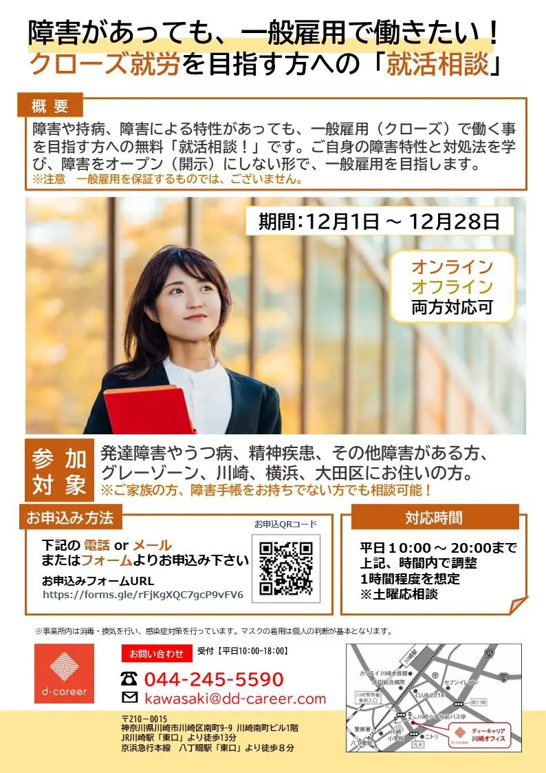 【ディーキャリア川崎オフィス】12月平日開催「障害があっても、一般雇用で働きたい! クローズ就労を目指す方への「就活相談」」