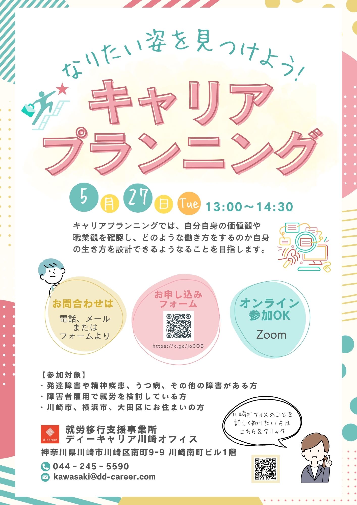 【ディーキャリア川崎オフィス】5月27日(火)「<地域限定:川崎市、横浜市、大田区にお住まいの方対象> なりたい姿を見つけよう!「キャリアプランニング」」