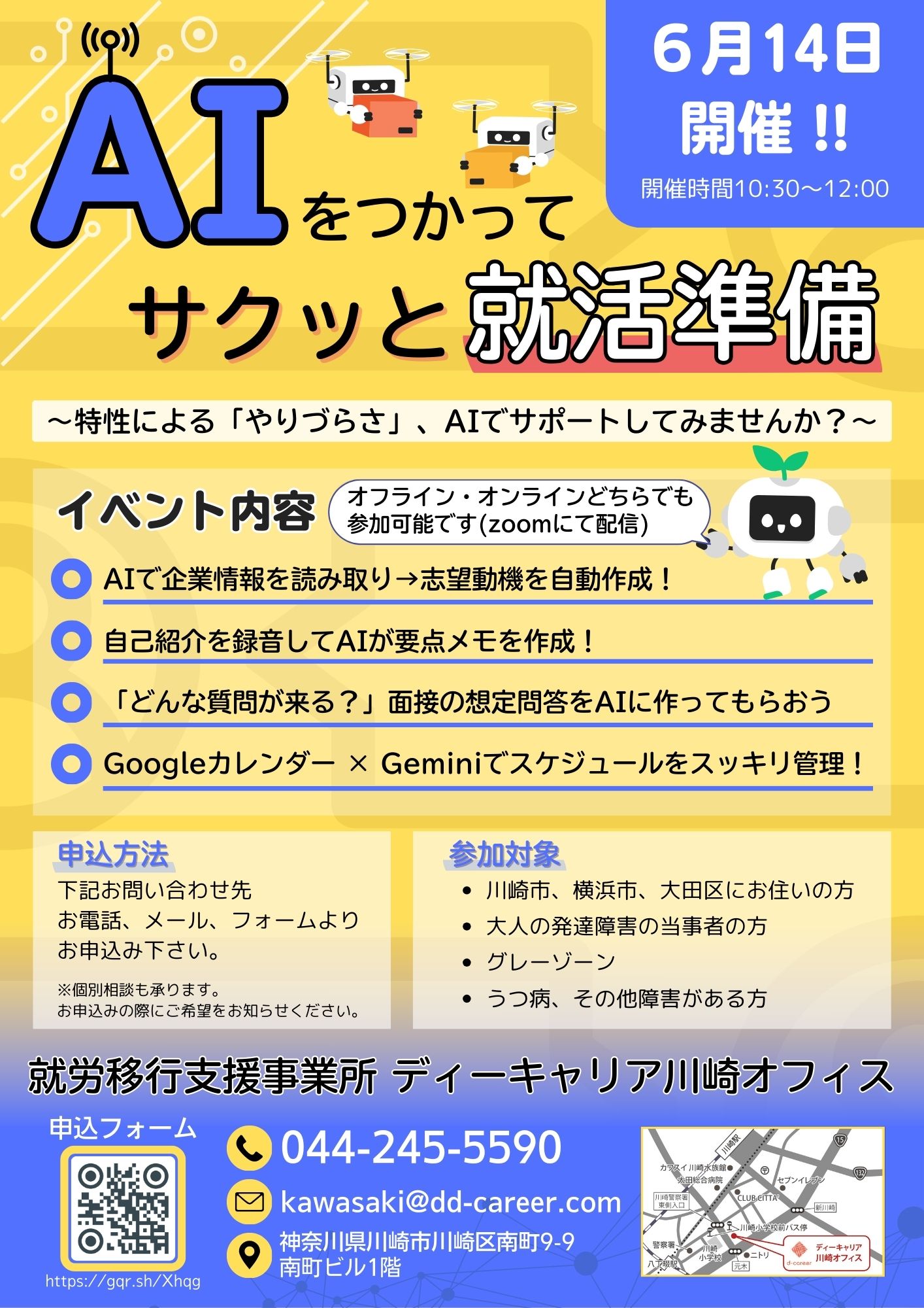【ディーキャリア川崎オフィス】6月14日(土)「<地域限定:川崎市、横浜市、大田区にお住まいの方対象> AIをつかってサクッと就活準備!」