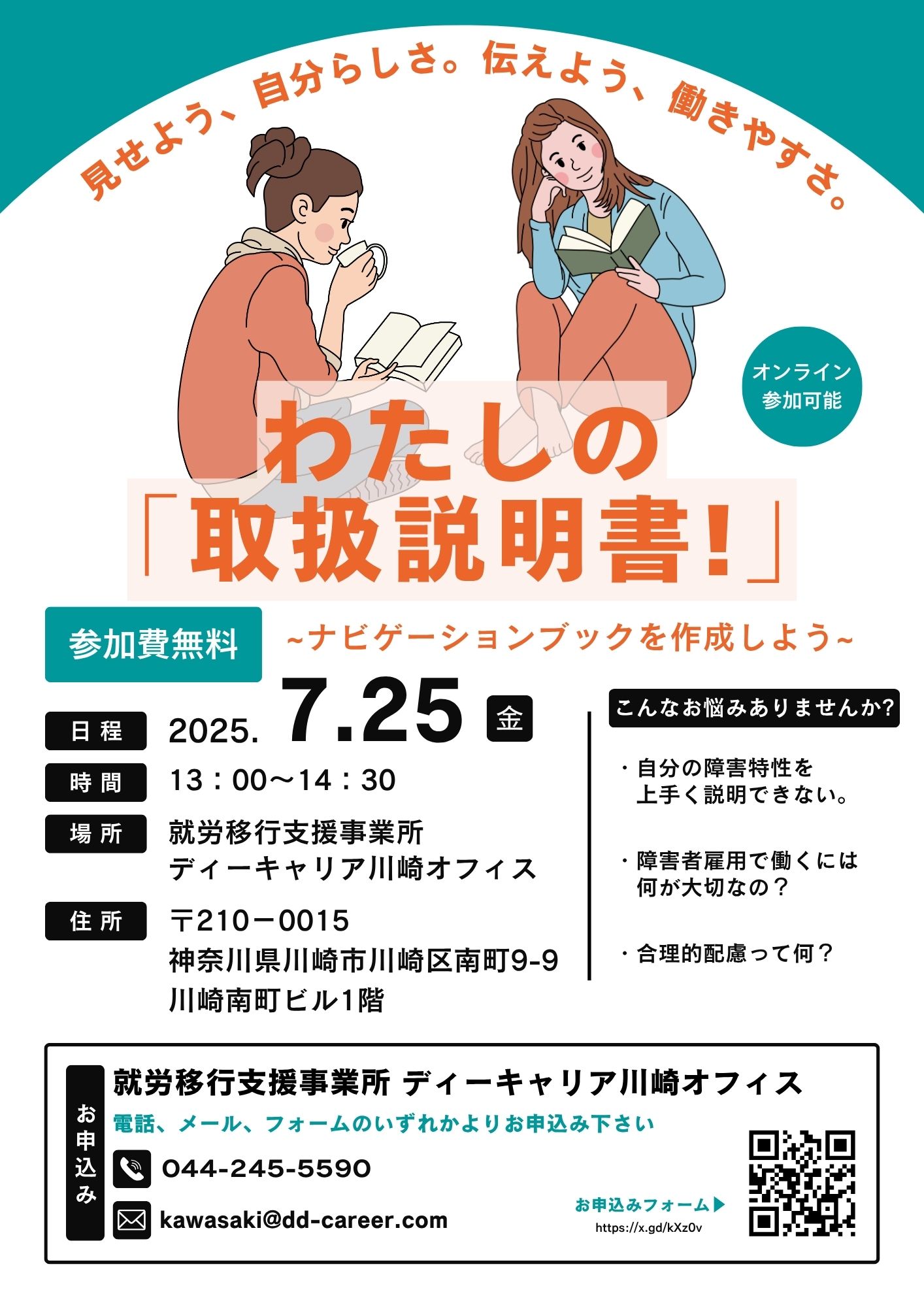【ディーキャリア川崎オフィス】7月25日(金)<地域限定:川崎市、横浜市、大田区にお住まいの方対象> 「わたしの取扱説明書! ナビゲーションブックを作成しよう」