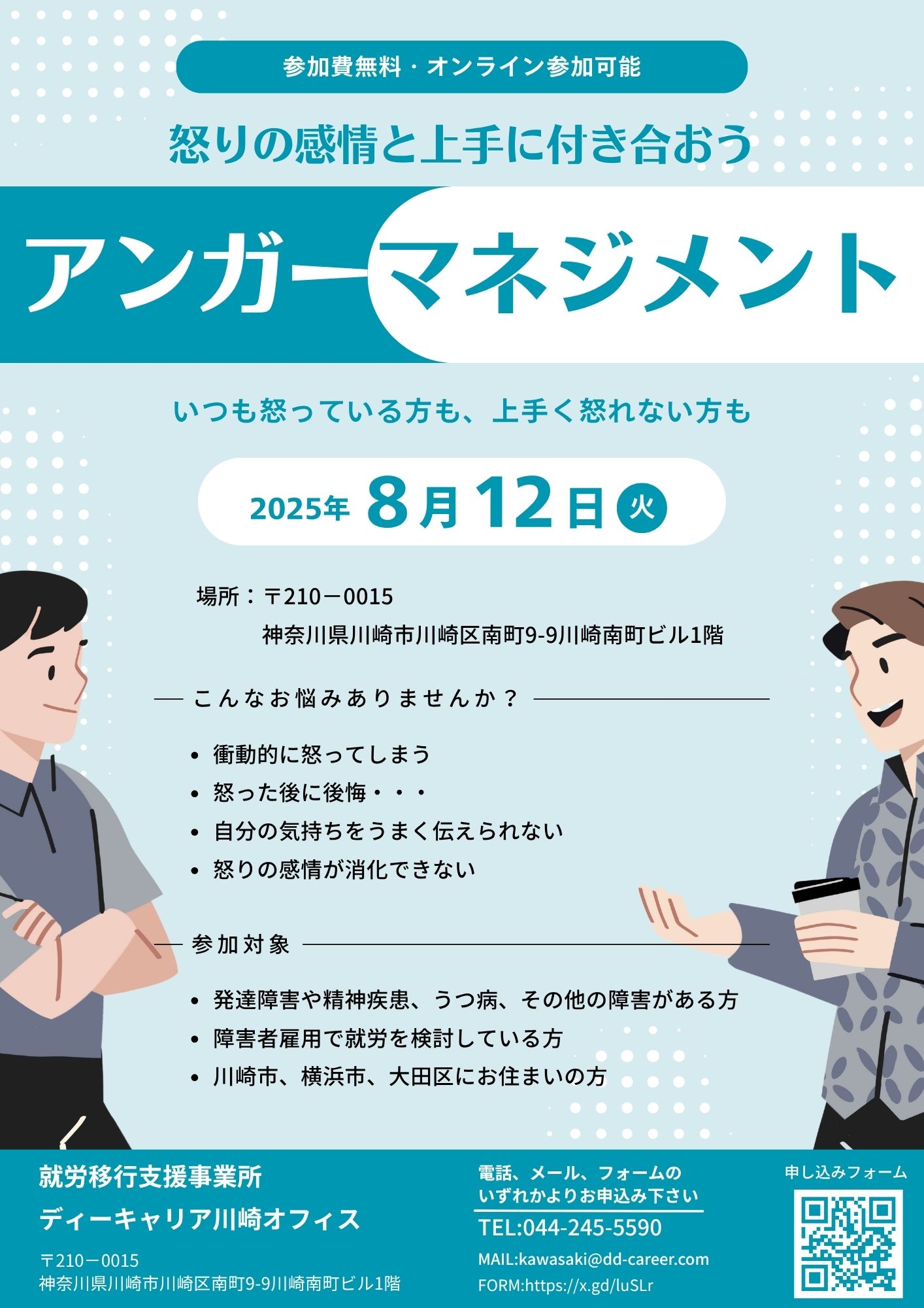 【ディーキャリア川崎オフィス】8月18日(水)「怒りの感情との上手な付き合い方 「アンガーマネジメント」 訓練体験会!」