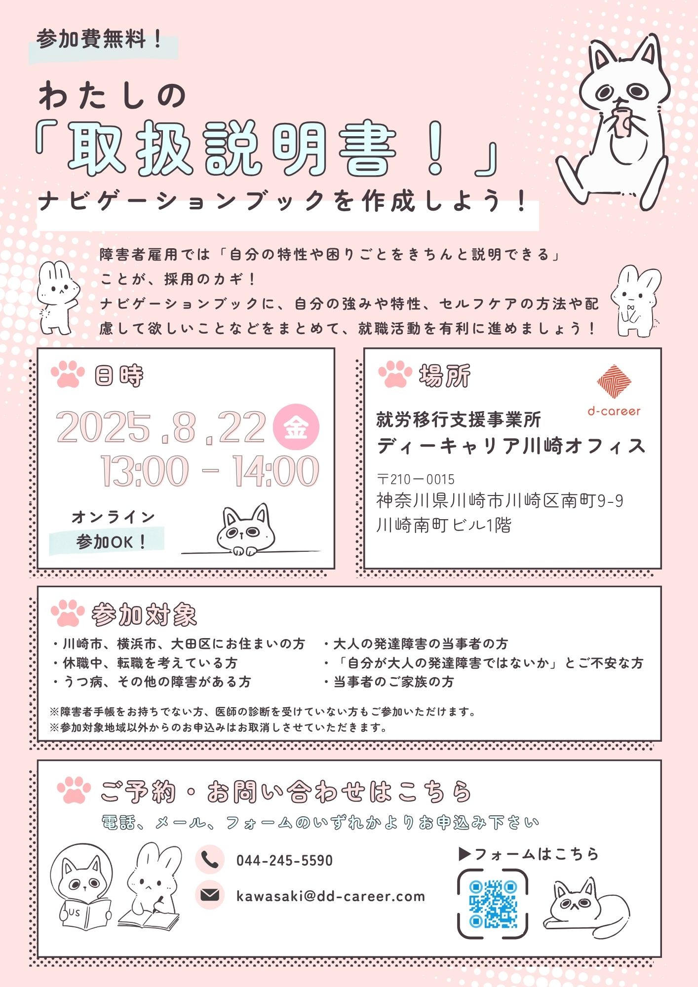【ディーキャリア川崎オフィス】8月22日(金)<地域限定:川崎市、横浜市、大田区にお住まいの方対象>「わたしの『取扱説明書!』ナビゲーションブックを作成しよう!」