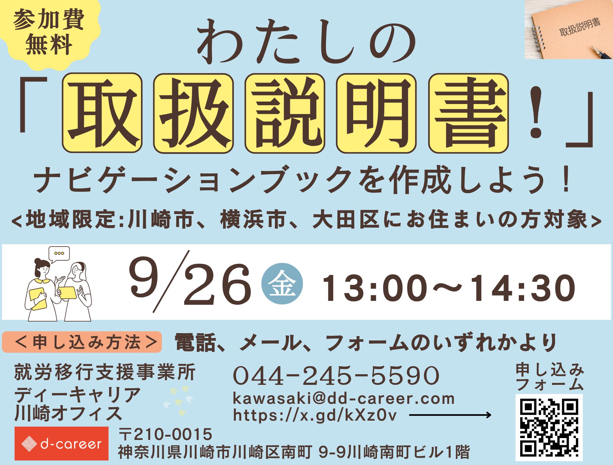 【ディーキャリア川崎オフィス】9月26日(金)<地域限定:川崎市、横浜市、大田区にお住まいの方対象>「わたしの『取扱説明書!』ナビゲーションブックを作成しよう!」
