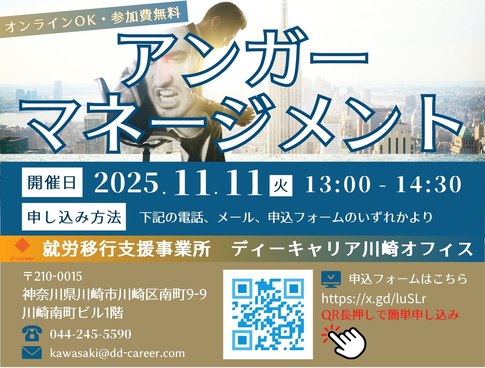 【ディーキャリア川崎オフィス】11月4日(水)「精神保健福祉士による 怒り!をコントロール! アンガーマネジメントとは!」