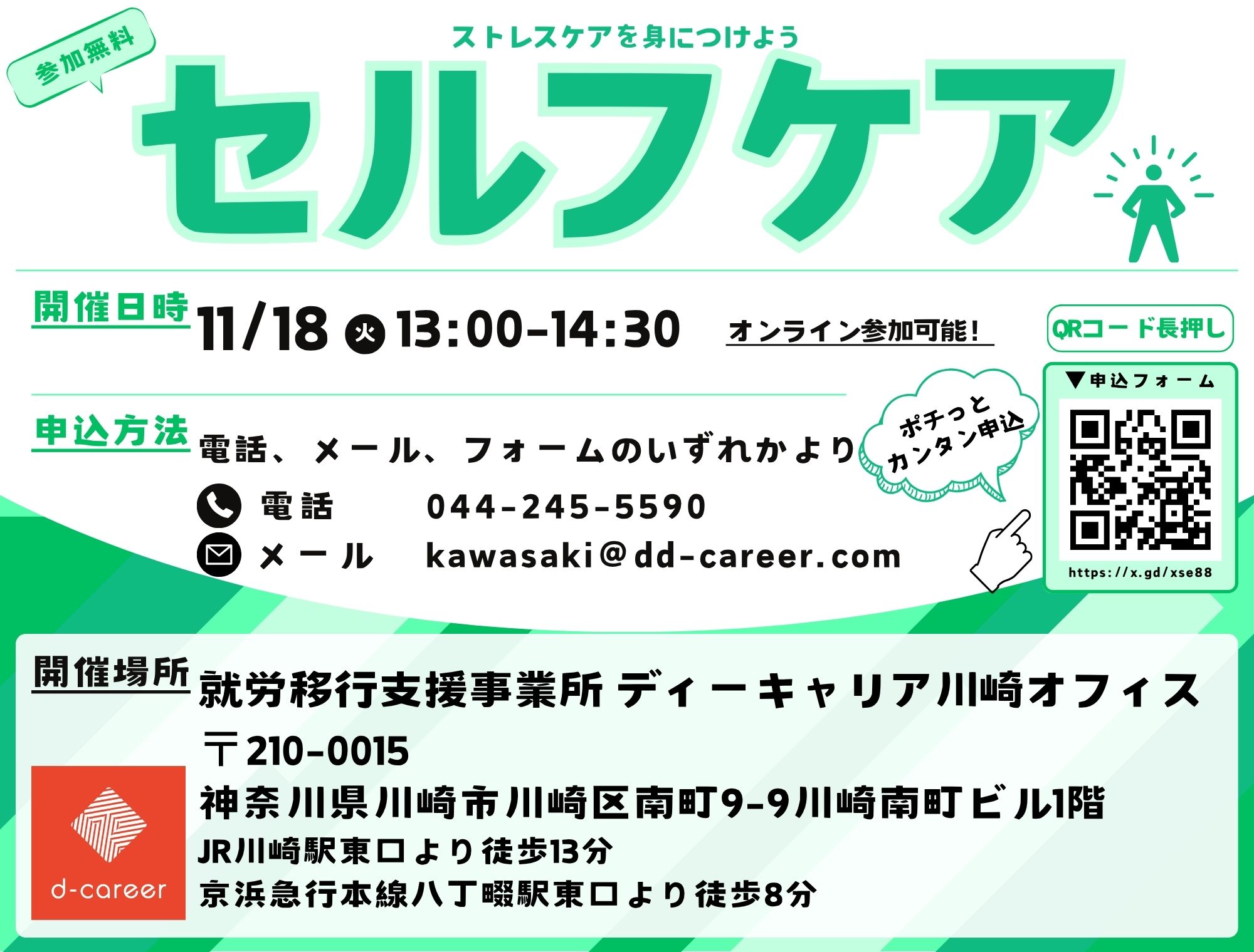 【ディーキャリア川崎オフィス】11月18日(火)<地域限定:川崎市、横浜市、大田区にお住まいの方対象>「ストレスケアを身に付けよう!セルフケア」