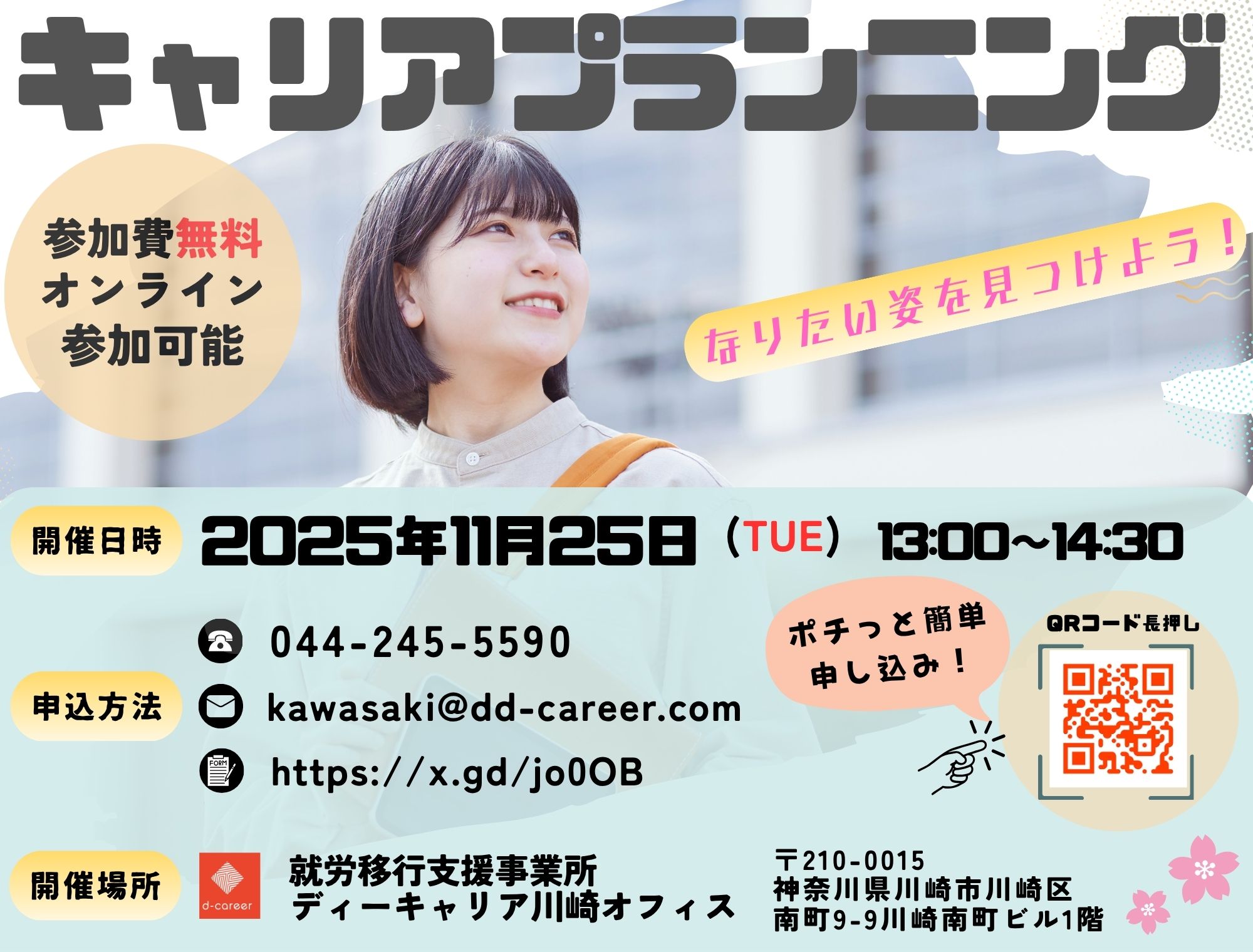 【ディーキャリア川崎オフィス】11月25日(火)<地域限定:川崎市、横浜市、大田区にお住まいの方対象> 「なりたい姿を見つけよう!『キャリアプランニング』」