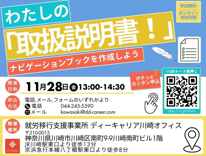 【ディーキャリア川崎オフィス】11月28日(金)<地域限定:川崎市、横浜市、大田区にお住まいの方対象>「わたしの『取扱説明書!』ナビゲーションブックを作成しよう!」