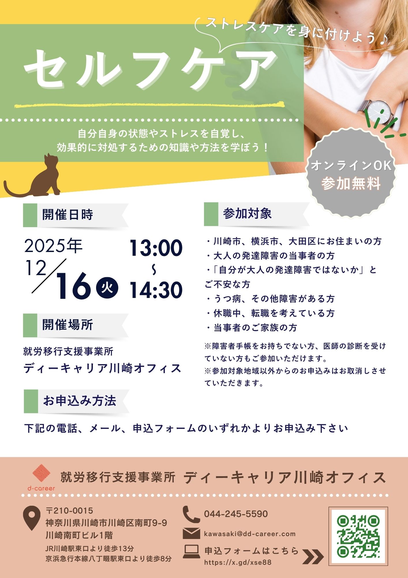 【ディーキャリア川崎オフィス】12月16日(火)<地域限定:川崎市、横浜市、大田区にお住まいの方対象>「ストレスケアを身に付けよう!セルフケア」