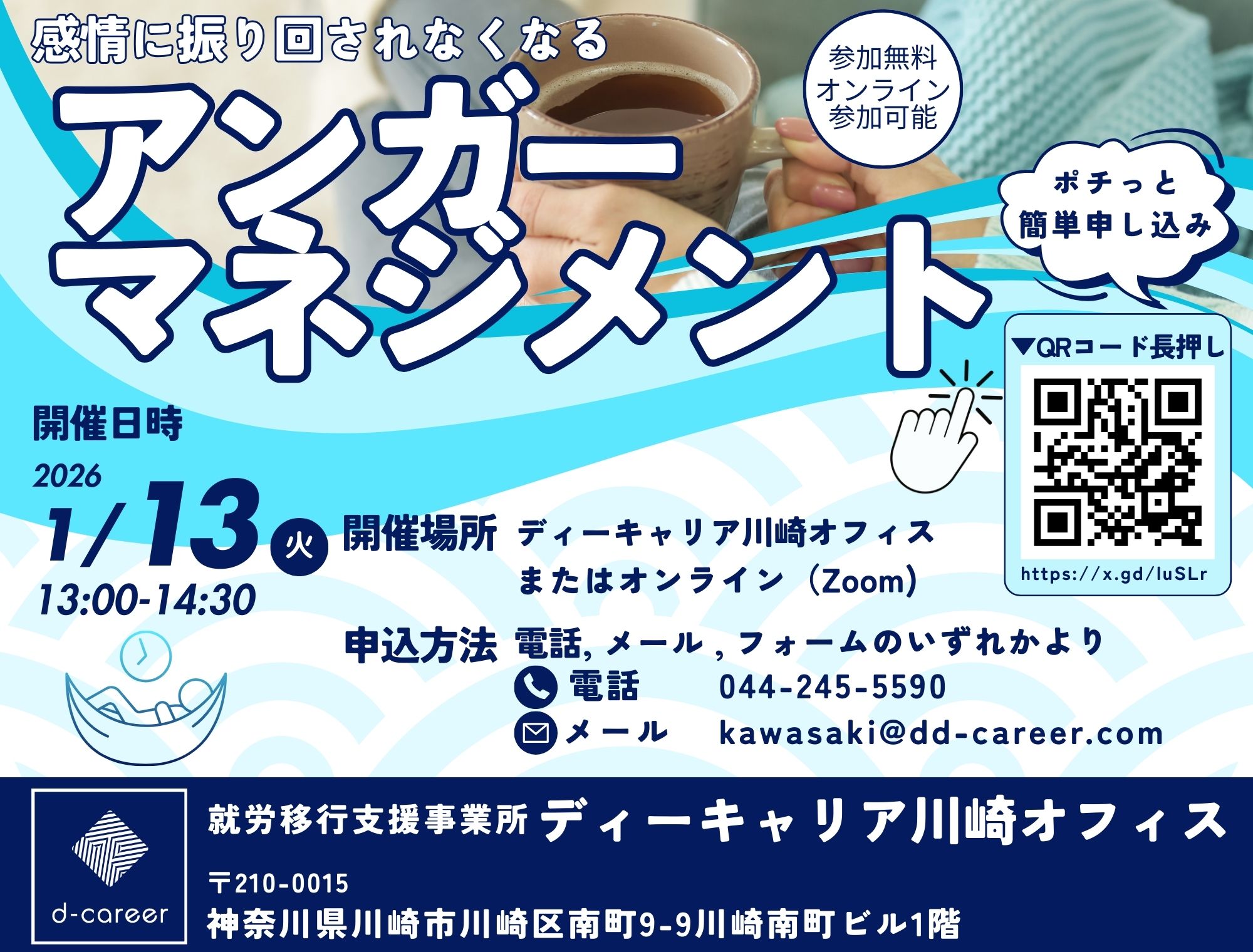 【ディーキャリア川崎オフィス】01月13日(火)「<地域限定:川崎市、横浜市、大田区にお住まいの方対象>怒りの感情と上手に付き合おう アンガーマネジメント」