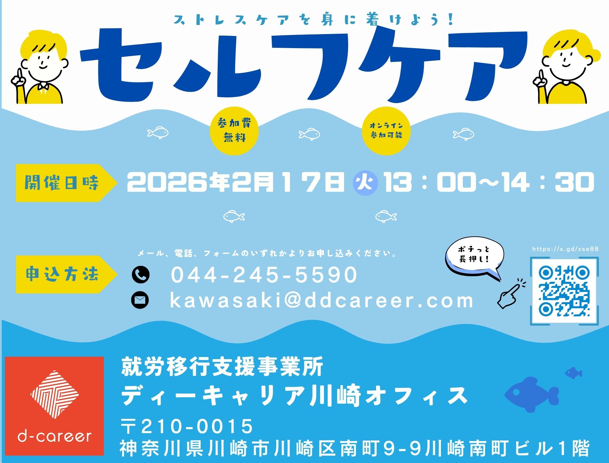 【ディーキャリア川崎オフィス】02月17日(火)「<地域限定:川崎市、横浜市、大田区にお住まいの方対象>ストレスケアを身に付けよう!セルフケア」