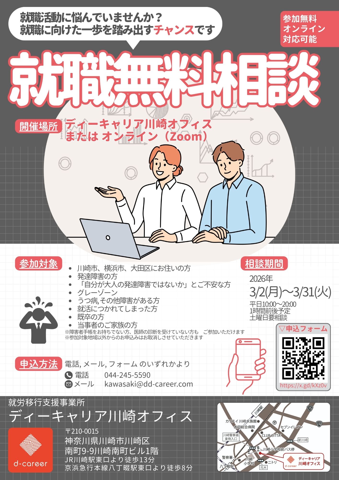 【ディーキャリア川崎オフィス】3月平日開催<地域限定:川崎市、横浜市、大田区にお住まいの方対象> 就職活動に悩んでませんか? 特性による困りごとのある方向け!「就活無料相談!」」