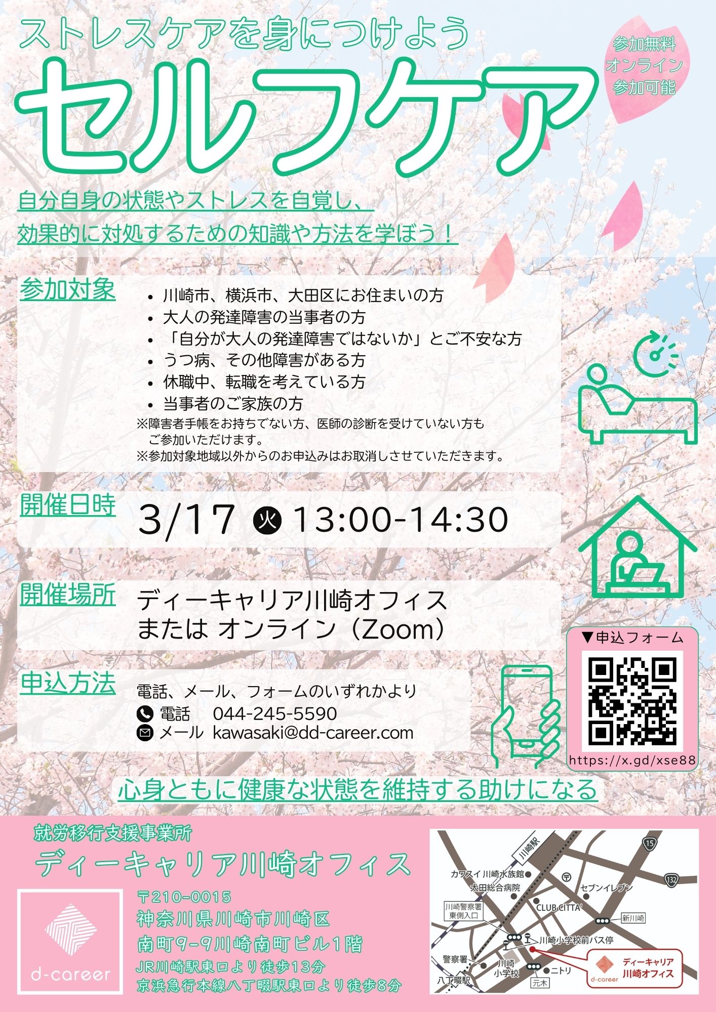 【ディーキャリア川崎オフィス】03月17日(火)「<地域限定:川崎市、横浜市、大田区にお住まいの方対象>ストレスケアを身に付けよう!セルフケア」