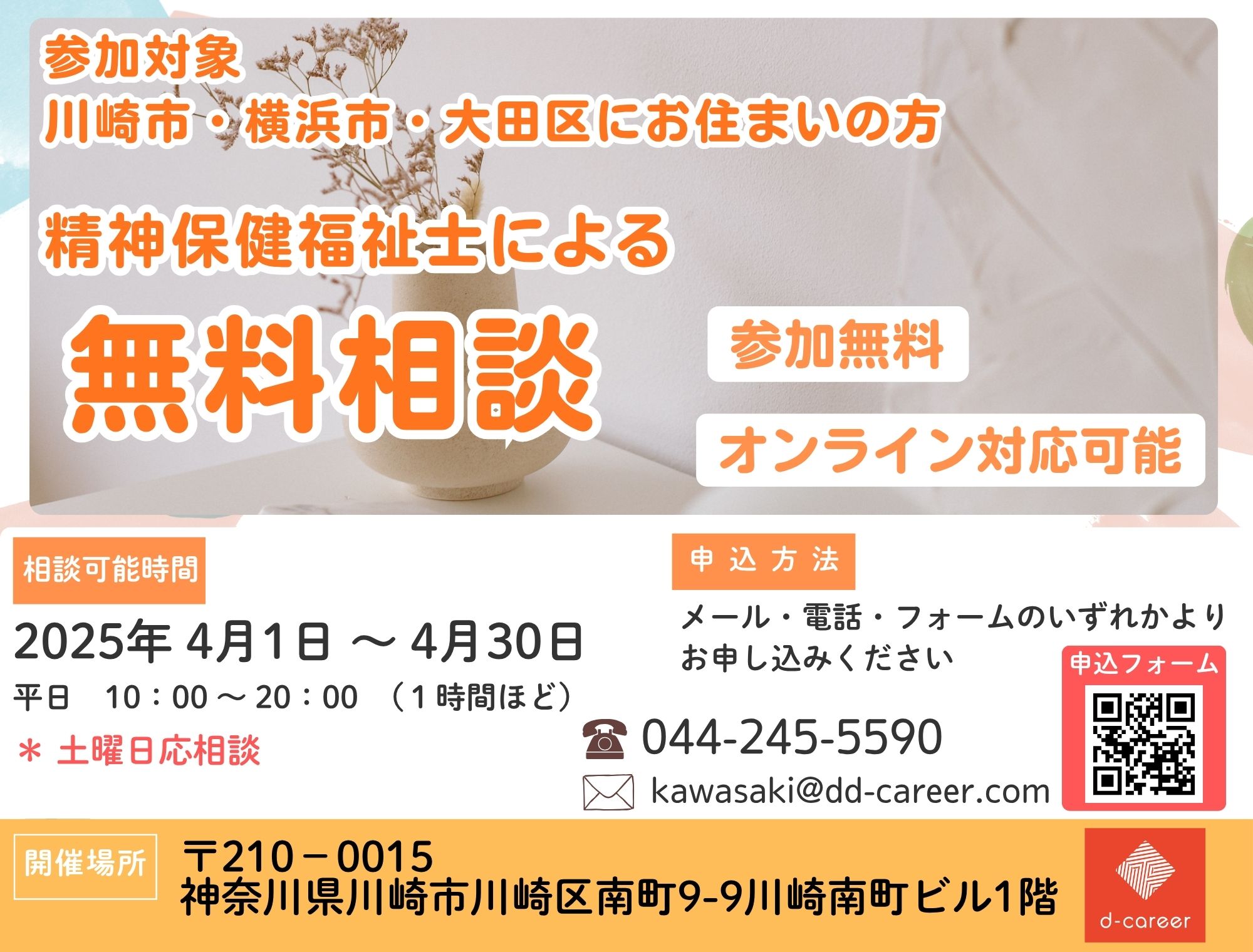 【ディーキャリア川崎オフィス】4月平日開催<地域限定:川崎市、横浜市、大田区にお住いの方限定>【精神保健福祉士】による【無料相談】精神障害、発達障害の特性による困りごと、お悩みのある方向け!」
