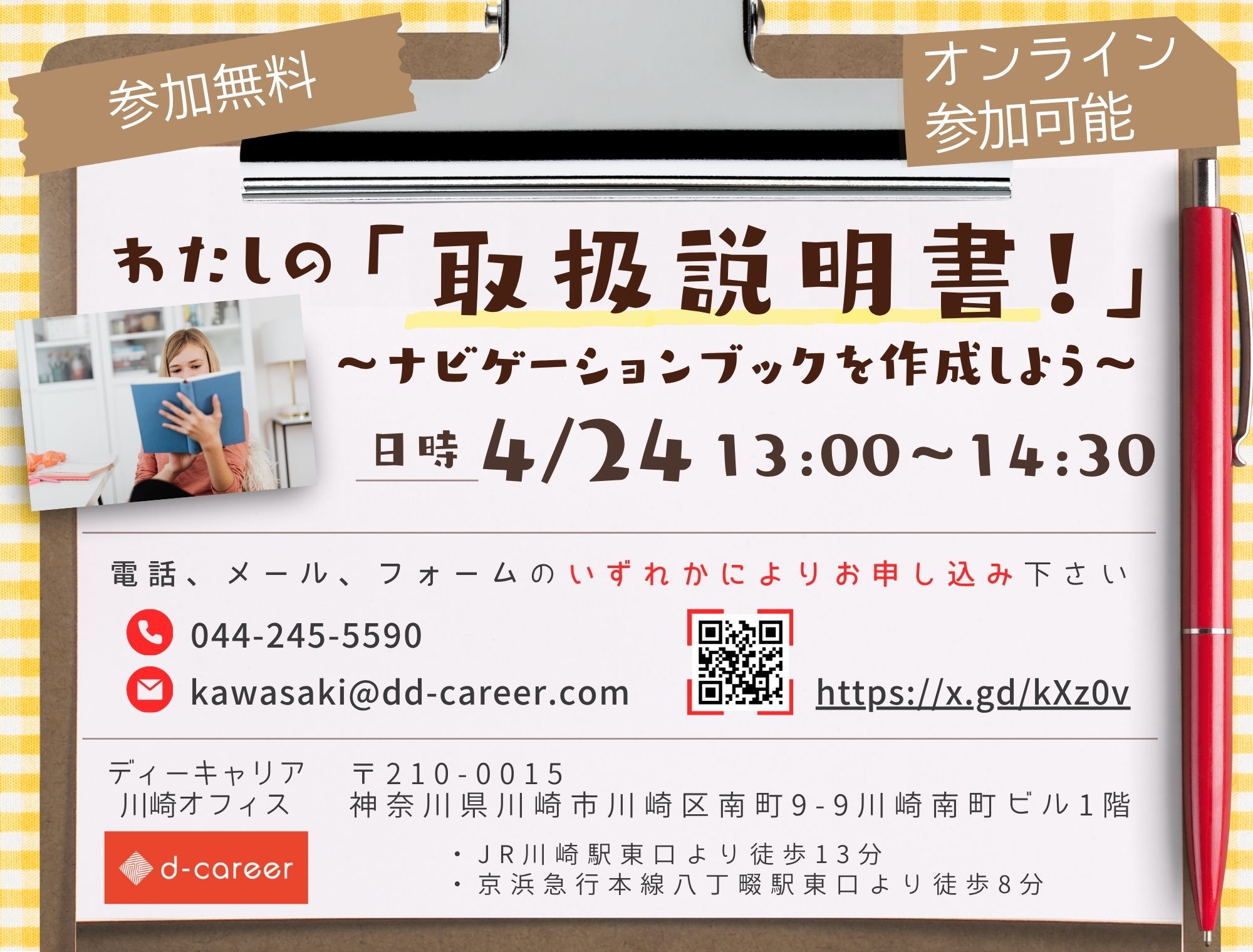 【ディーキャリア川崎オフィス】04月24日(金)「<地域限定:川崎市、横浜市、大田区にお住まいの方対象> わたしの「取扱説明書!」ナビゲーションブックを作成しよう!」