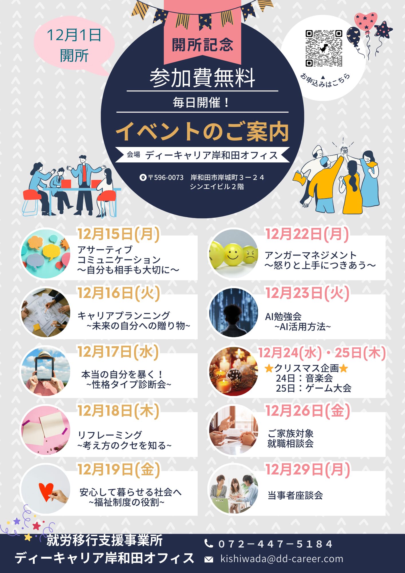 【ディーキャリア岸和田オフィス】12月15日(月)・16日(火)・17日(水)・18日(木)・19日(金)・22日(月)・23日(火)・24日(水)・25日(木)・26日(金)・29日(月)「12月15日~29日 開所記念スペシャルイベントを開催します!」
