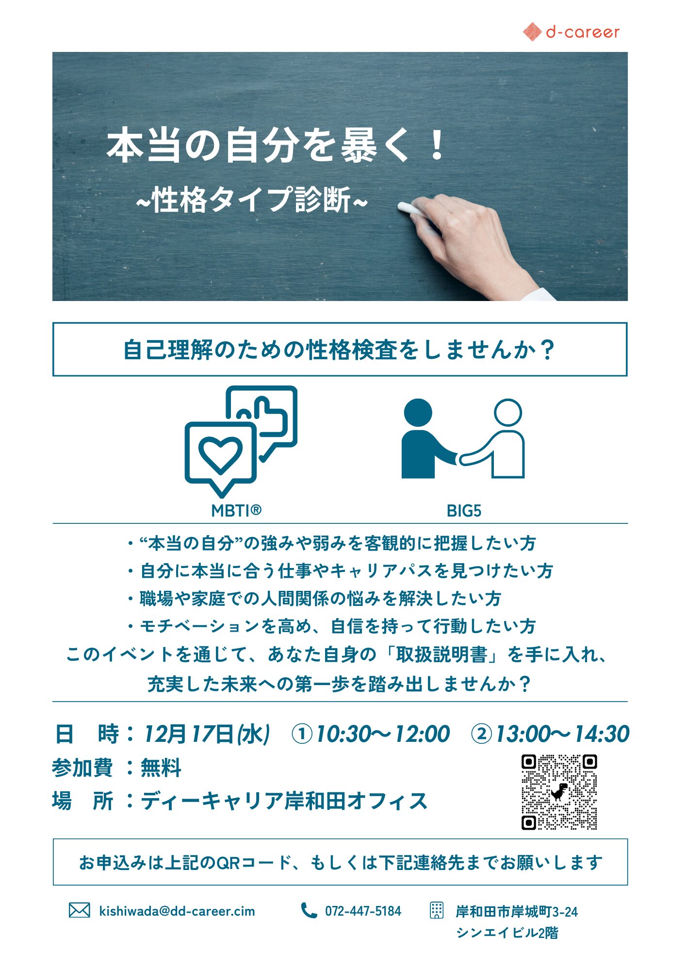 【ディーキャリア岸和田オフィス】12月17日(水)「本当の自分を暴く!~性格タイプ診断会~」