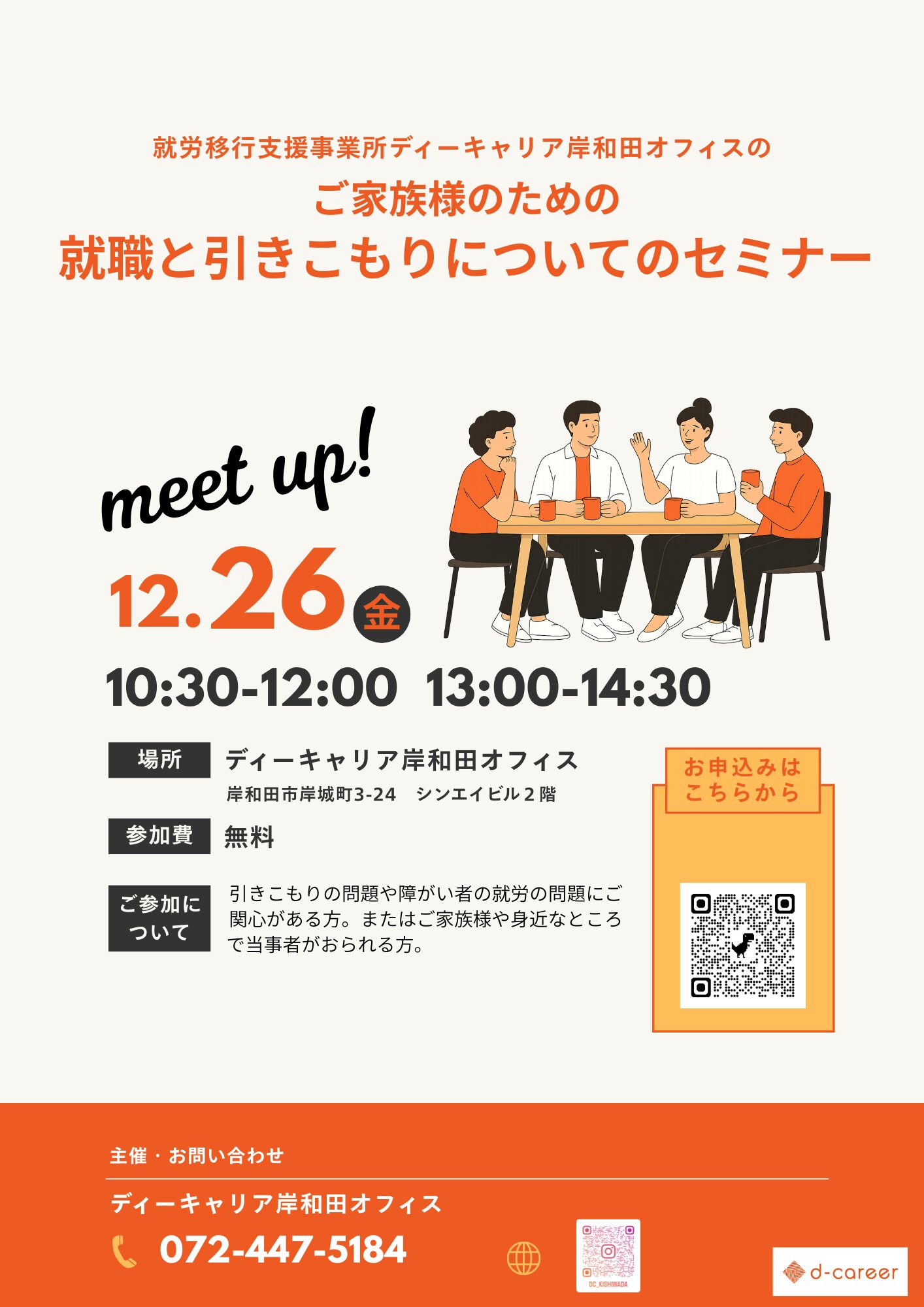 【ディーキャリア岸和田オフィス】12月26日(金)「ご家族様のための就職相談会 ~就職と引きこもりについて~」