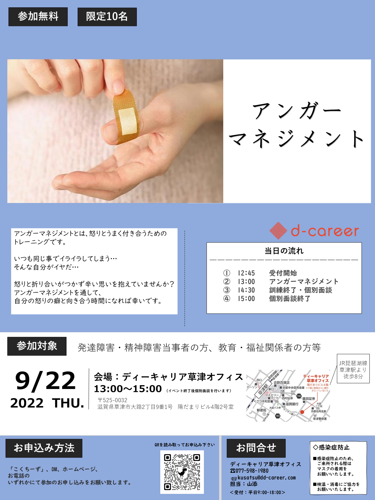 【ディーキャリア草津オフィス】9月22日(木)「感情のコントロール『アンガーマネジメント』講座」
