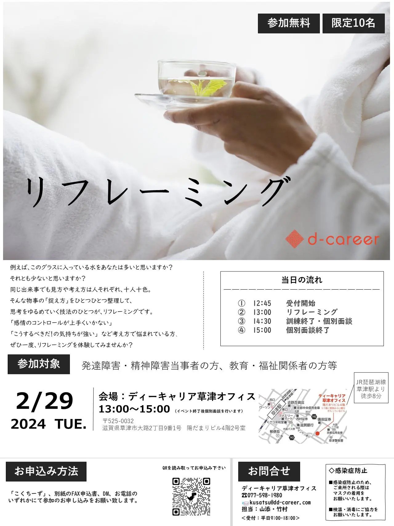 【ディーキャリア草津オフィス】2月29日(木)開催「リフレーミング」