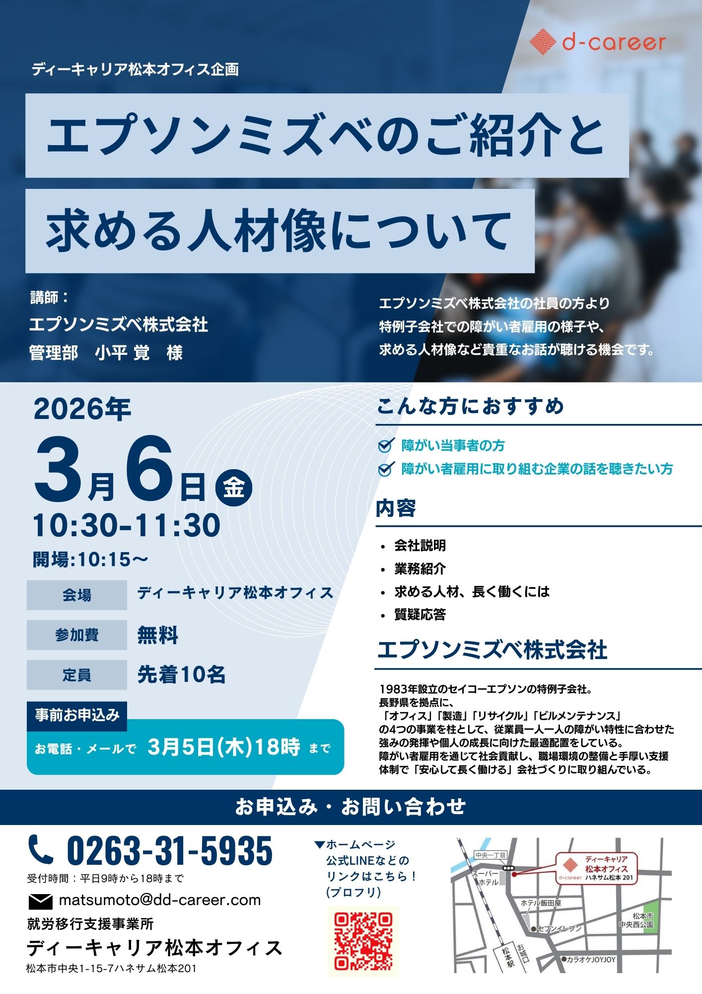【ディーキャリア松本オフィス】3月6日(金)「エプソンミズベのご紹介と求める人材像について~企業説明会~」