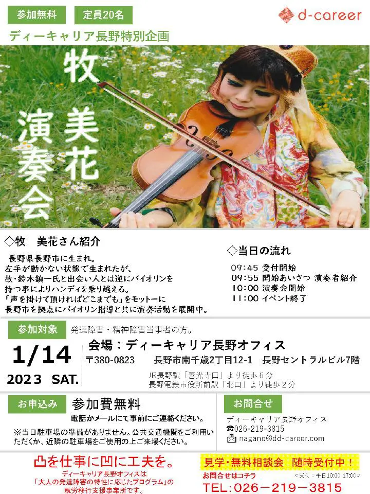 【ディーキャリア長野オフィス】1月14日(土)「牧 美花(まき みか)バイオリン演奏会」