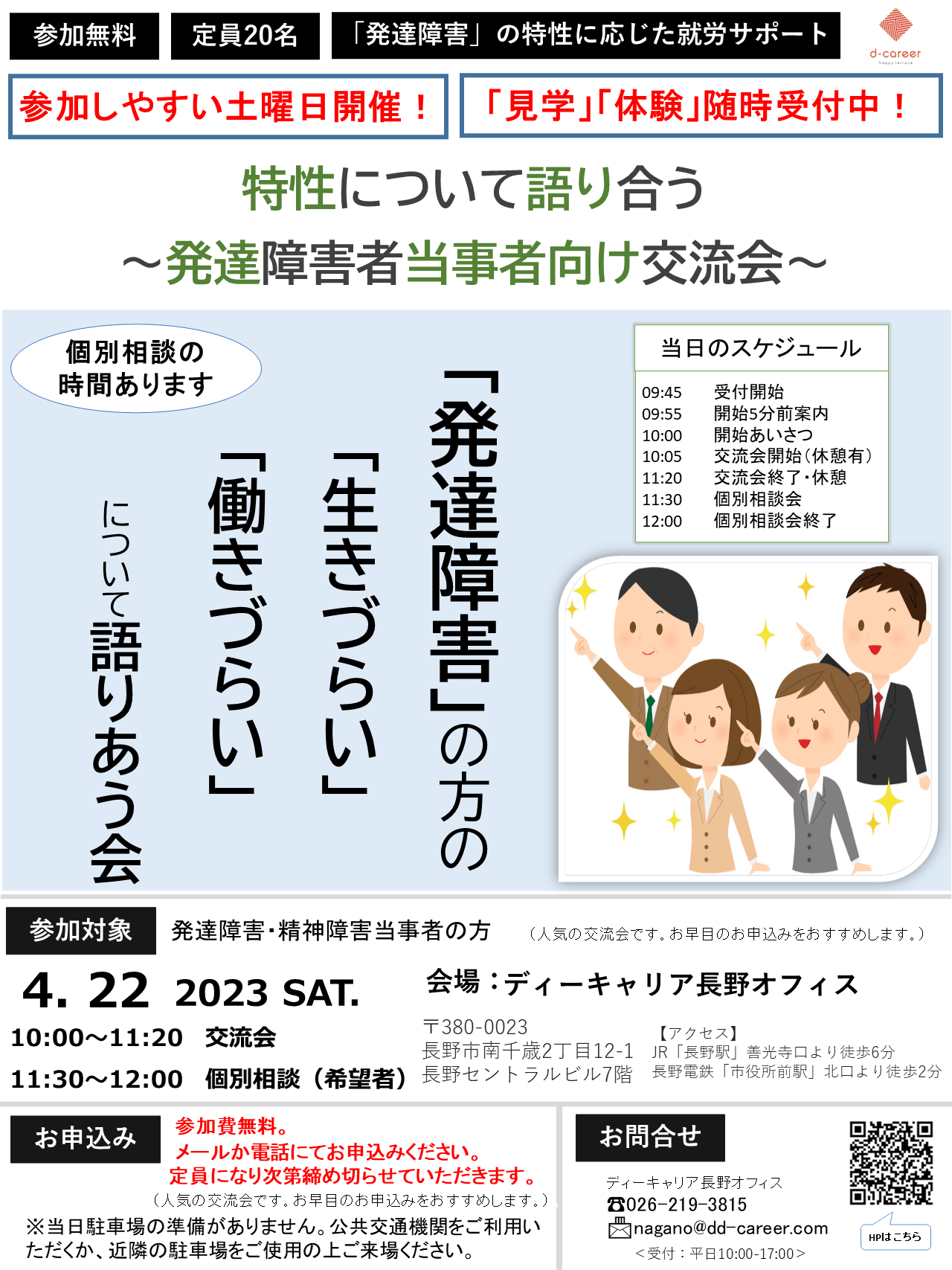 【ディーキャリア長野オフィス】4月25日(火)「特性について語り合う~発達障害者当事者向け交流会~」