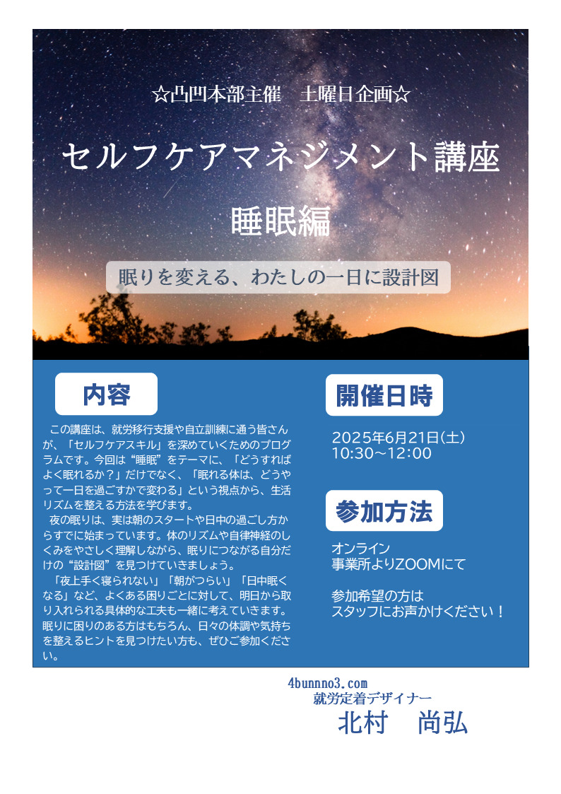 【ディーキャリア長野オフィス】6月21日(土)「凸凹本部主催「セルフマネジメント講座・睡眠編」」