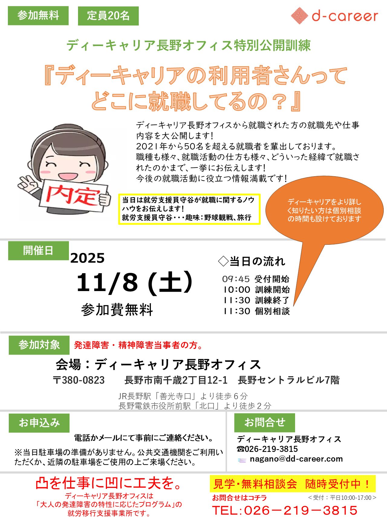 【ディーキャリア長野オフィス】11月08日(土)「『ディーキャリアの利用者さんってどこに就職してるの?』」