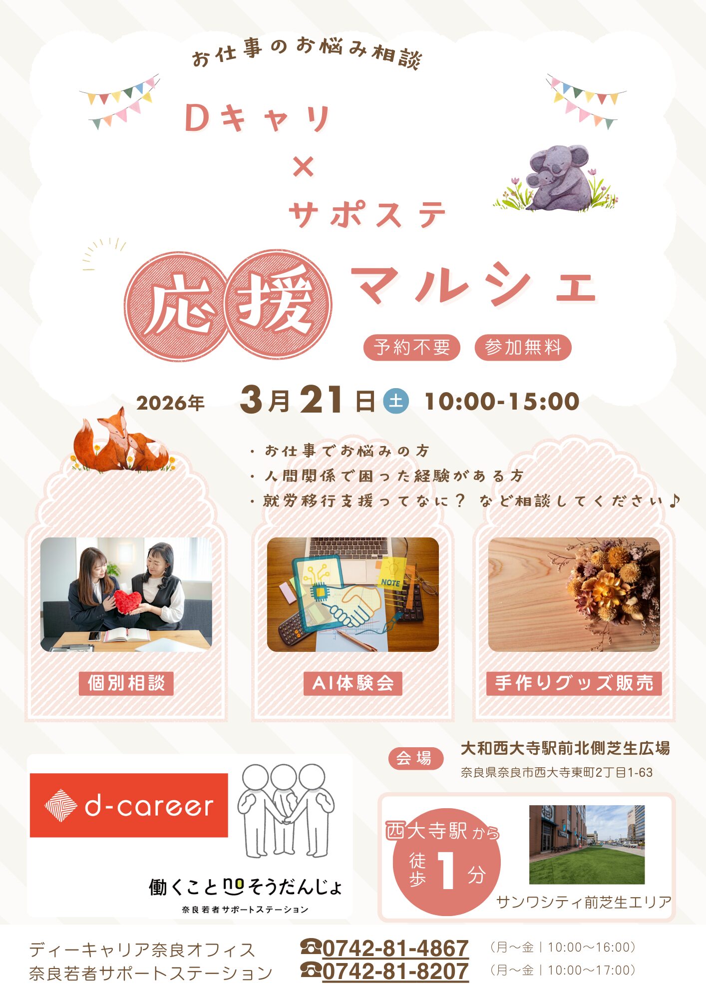 【ディーキャリア奈良オフィス】3月21日(土)「Dキャリ×サポステ応援マルシェ」