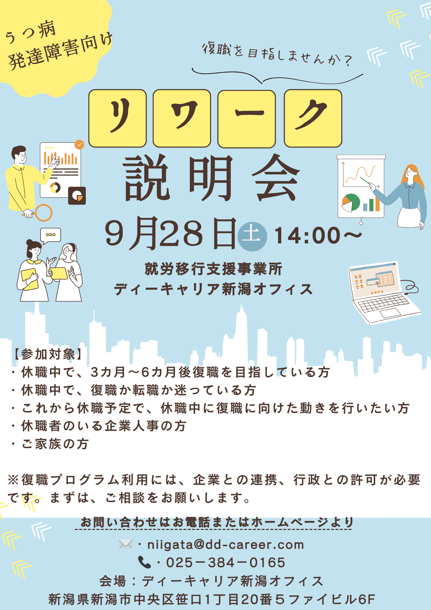 【ディーキャリア新潟オフィス】9月28日(土)「「発達障害がある・うつ病」で休職中の方向けリワーク説明会」