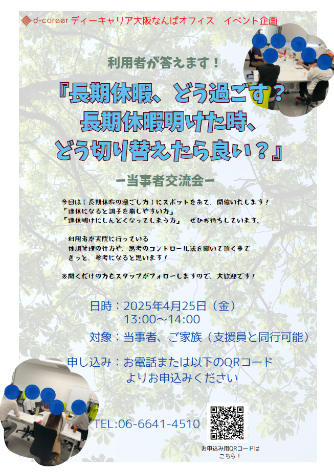 【ディーキャリア大阪なんばオフィス】4月25日(金)「長期休暇、どう過ごす?長期休暇が明けた時、どう切り替えたら良い?」