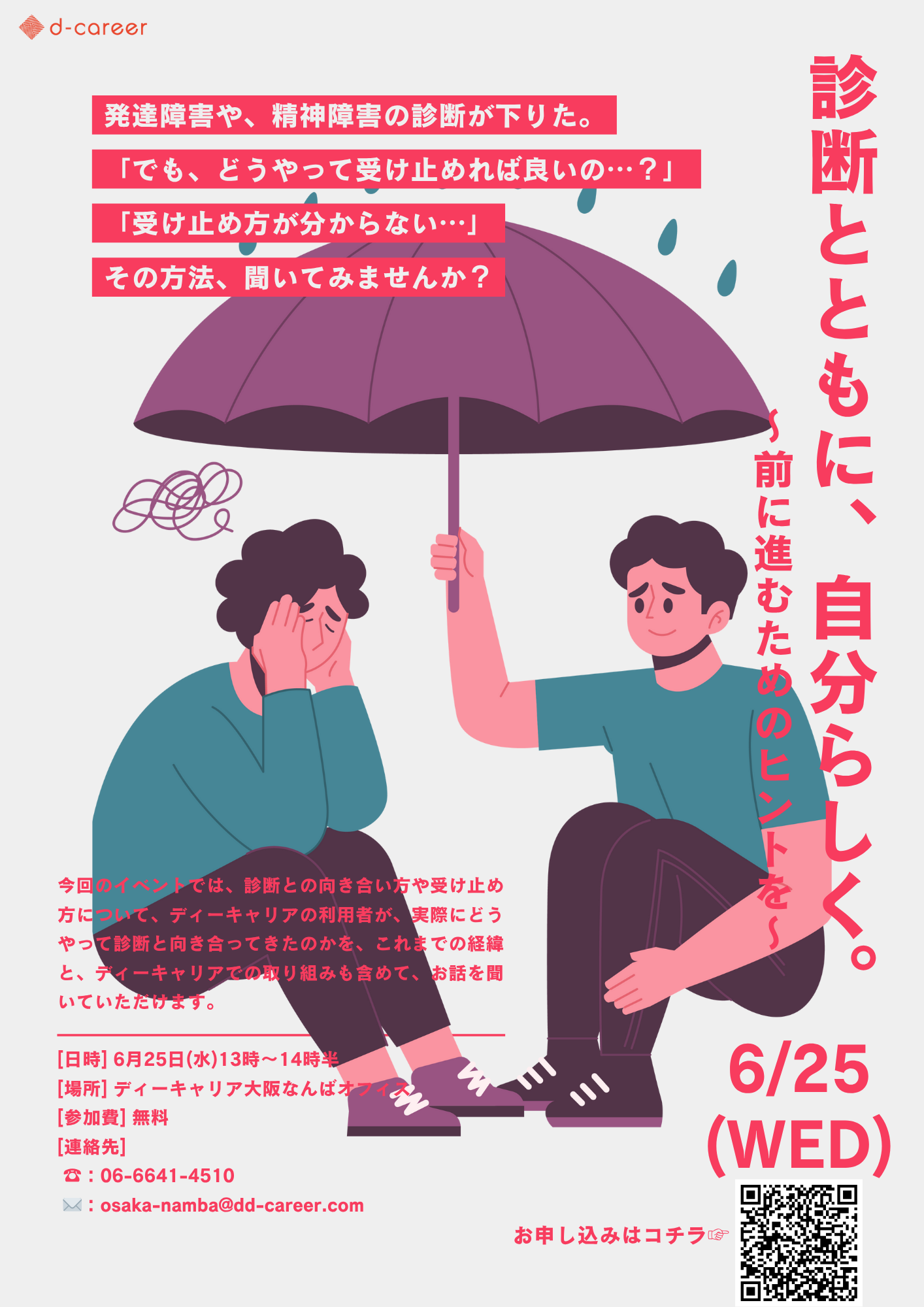 【ディーキャリア大阪なんばオフィス】6月25日(水)「診断とともに、自分らしく。~前に進むためのヒントを~」