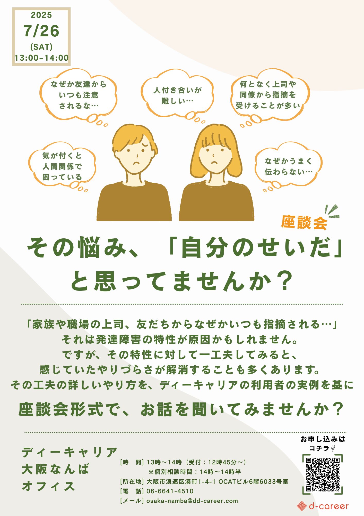 【ディーキャリア大阪なんばオフィス】7月26日(土)「その悩み、『自分のせいだ』と思っていませんか?」