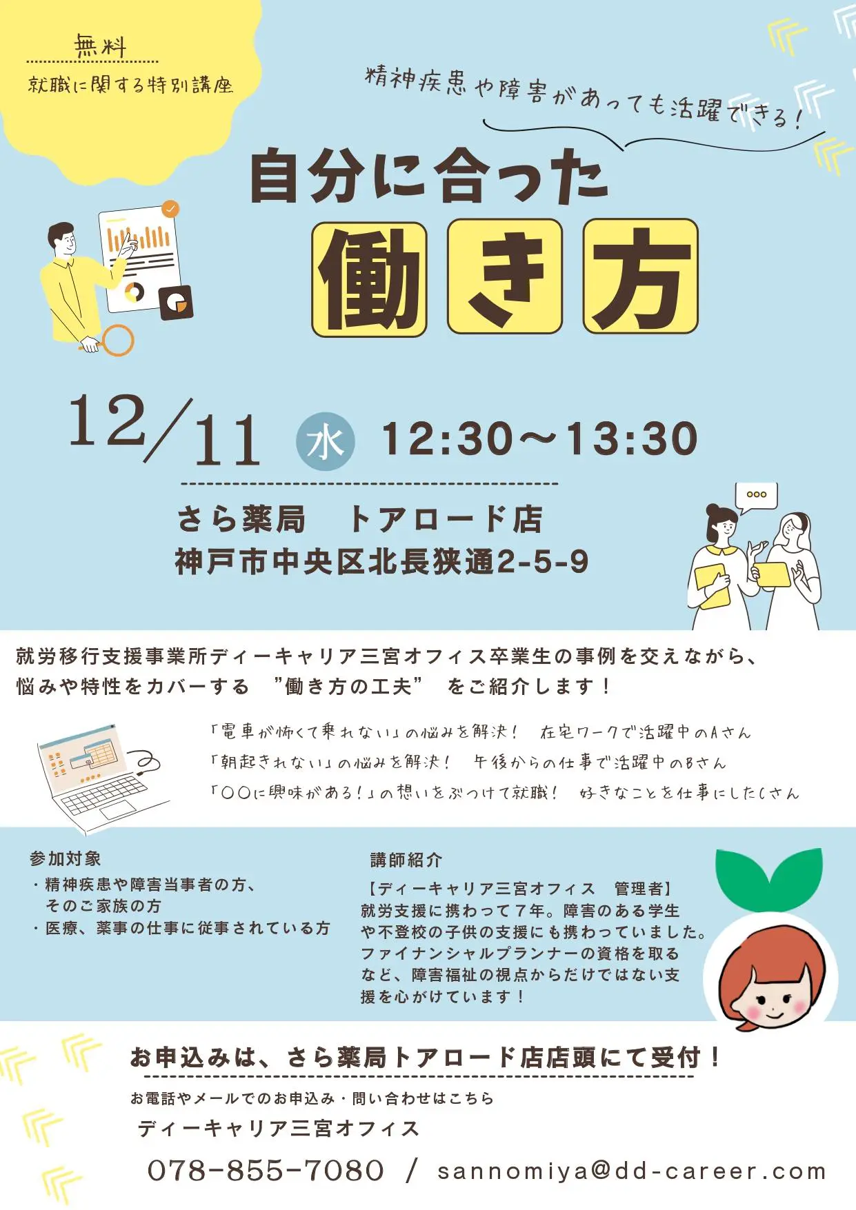 【ディーキャリア三宮オフィス】12月11日(水)「【精神疾患や障害があっても活躍できる!】自分に合った働き方」