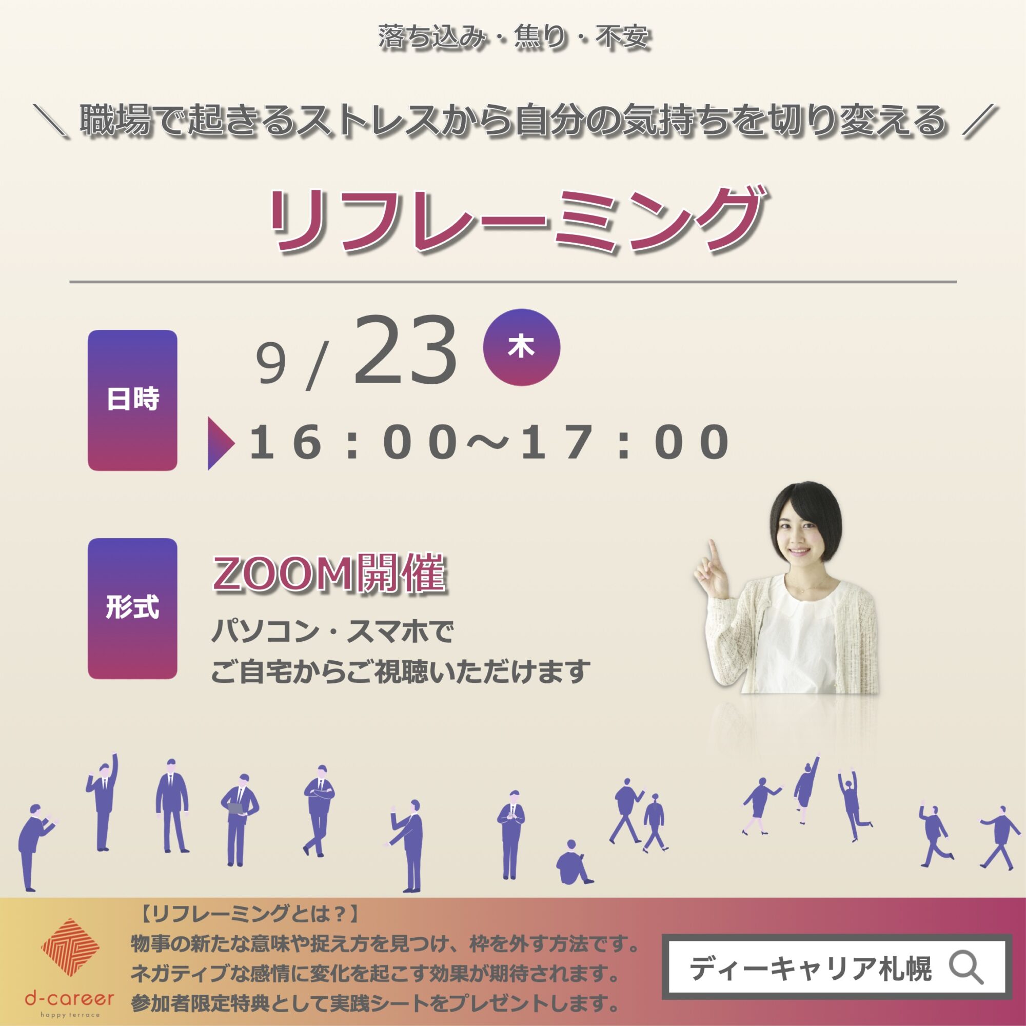 【ディーキャリア札幌オフィス】9月23日(木)「【ZOOM】職場で起きるストレスから自分の気持ちを切り変える:リフレーミング」